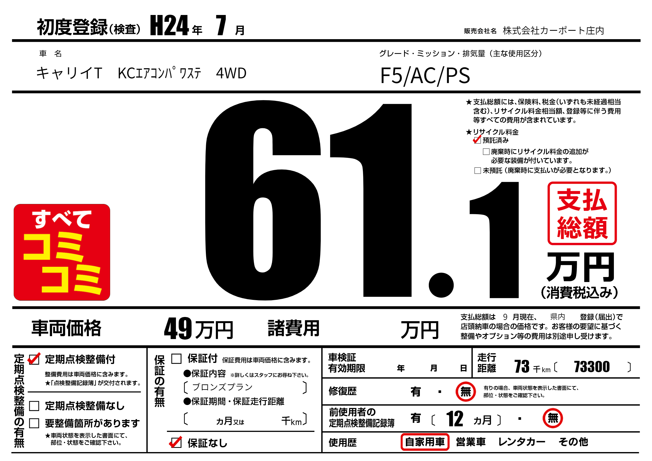 | 走行キロ | 7.3万km | 初年度登録 | H24年7月 |