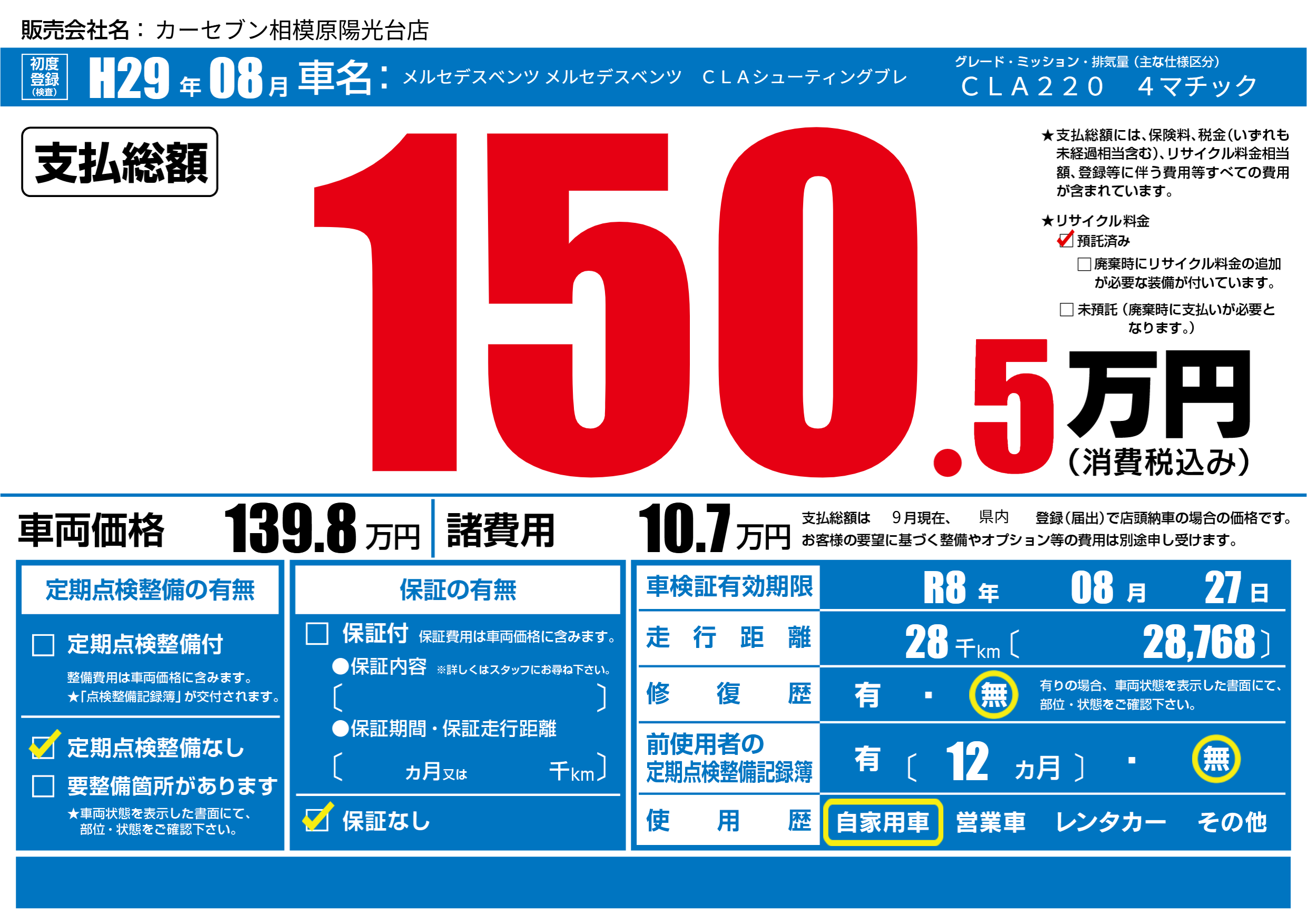 | 車検制限 | R8年 08月 27日 | ||