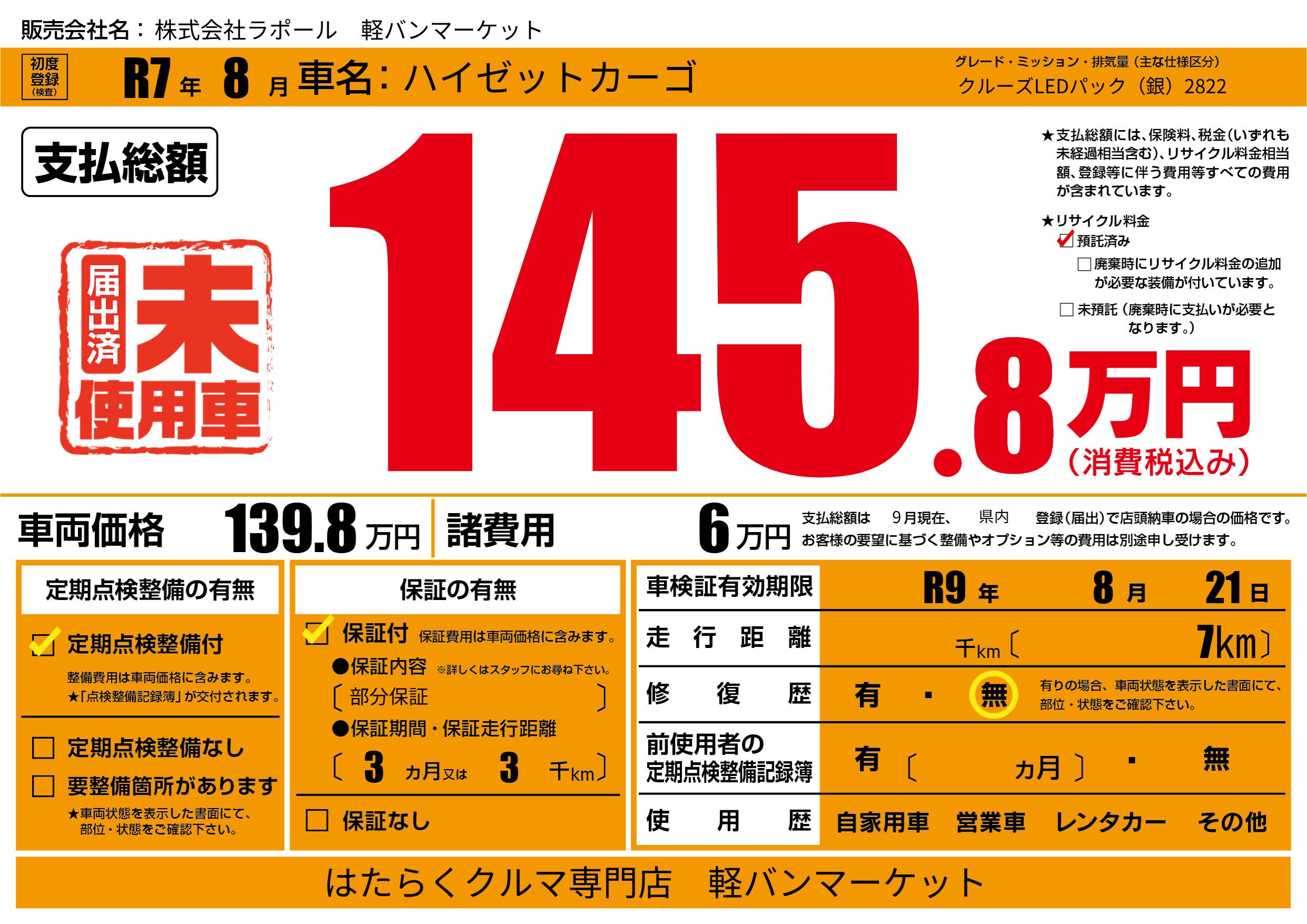 | 走行キロ | - | 初年度登録 | R7年8月 |