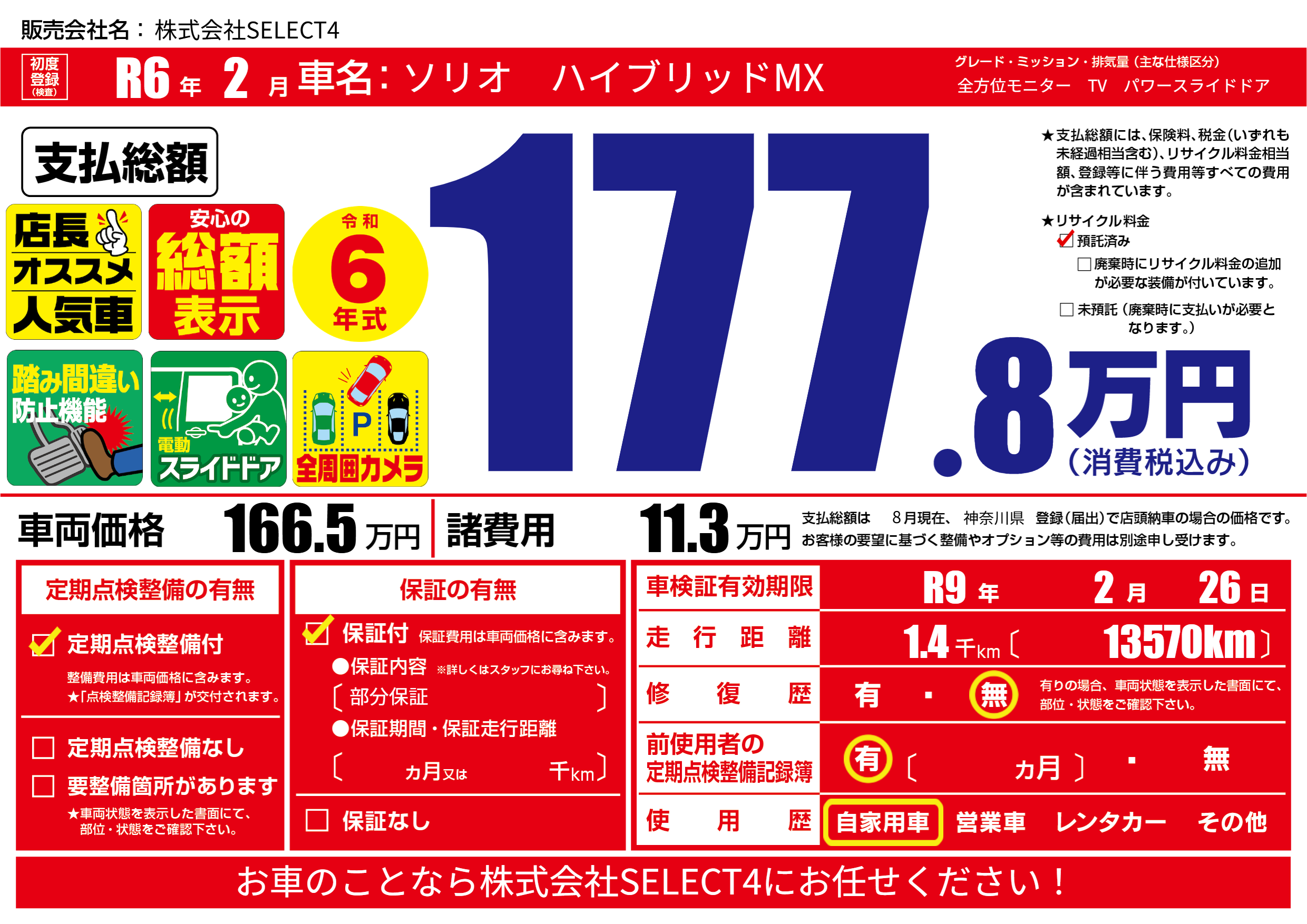 | 走行キロ | 0.1万km | 初年度登録 | R6年2月 |