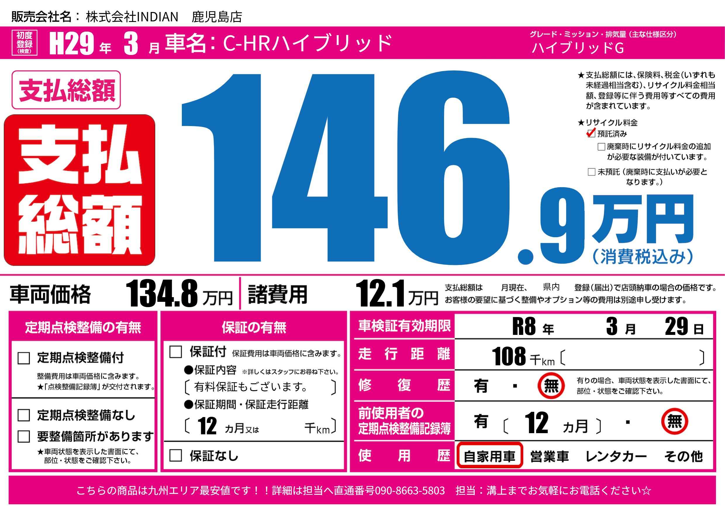 | 走行キロ | 10.8万km | 初年度登録 | H29年3月 |
