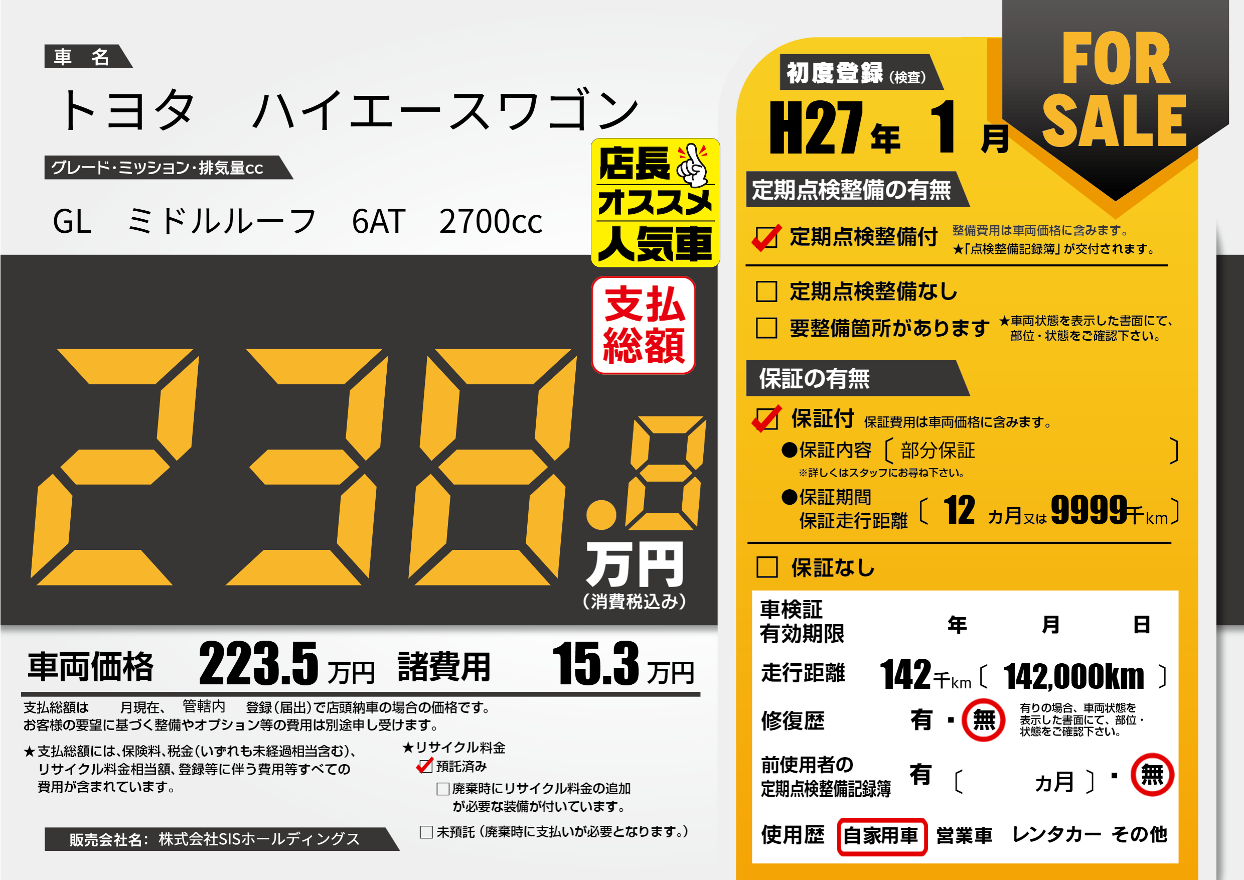 | 走行キロ | 14.2万km | 初年度登録 | H27年1月 |