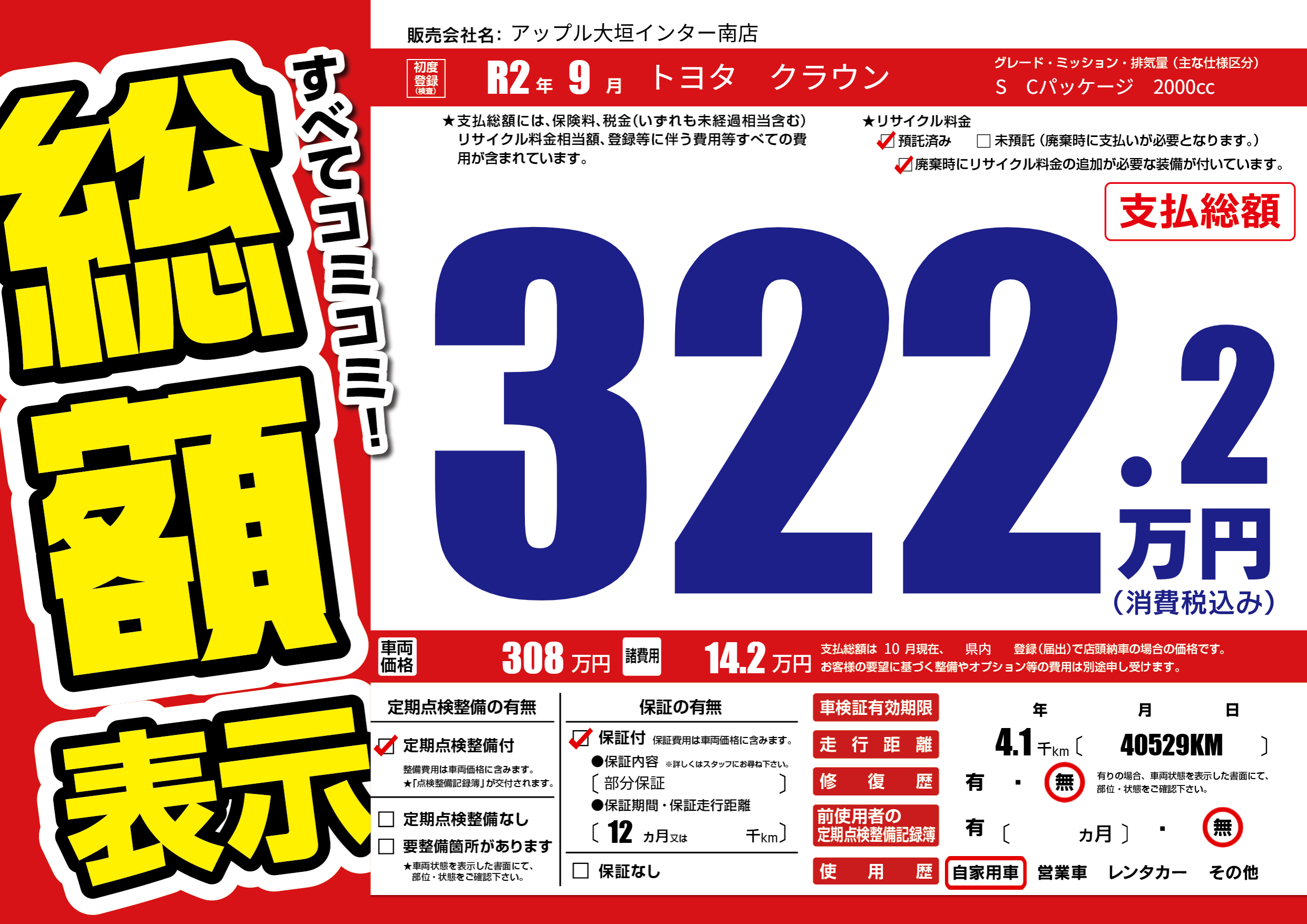 | 走行キロ | 0.4万km | 初年度登録 | R2年9月 |