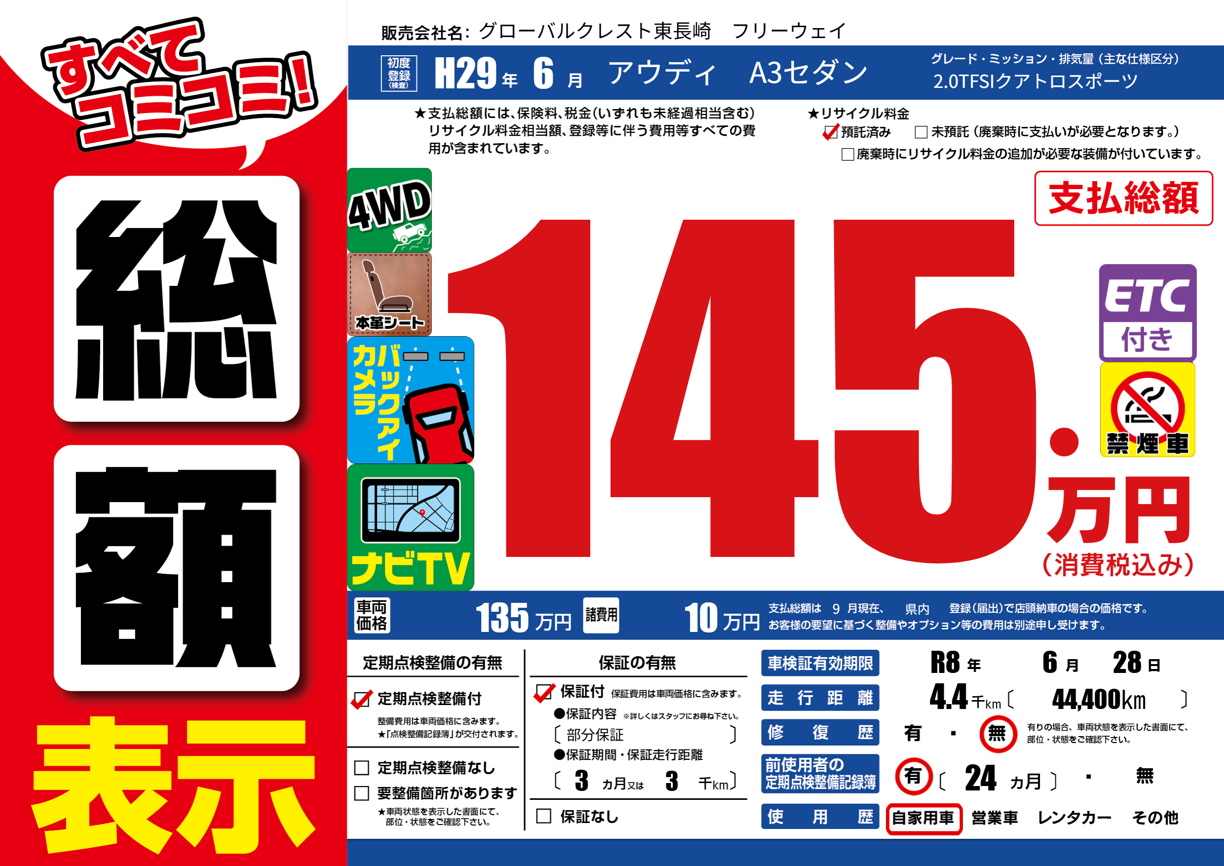 | 走行キロ | 0.4万km | 初年度登録 | H29年6月 |