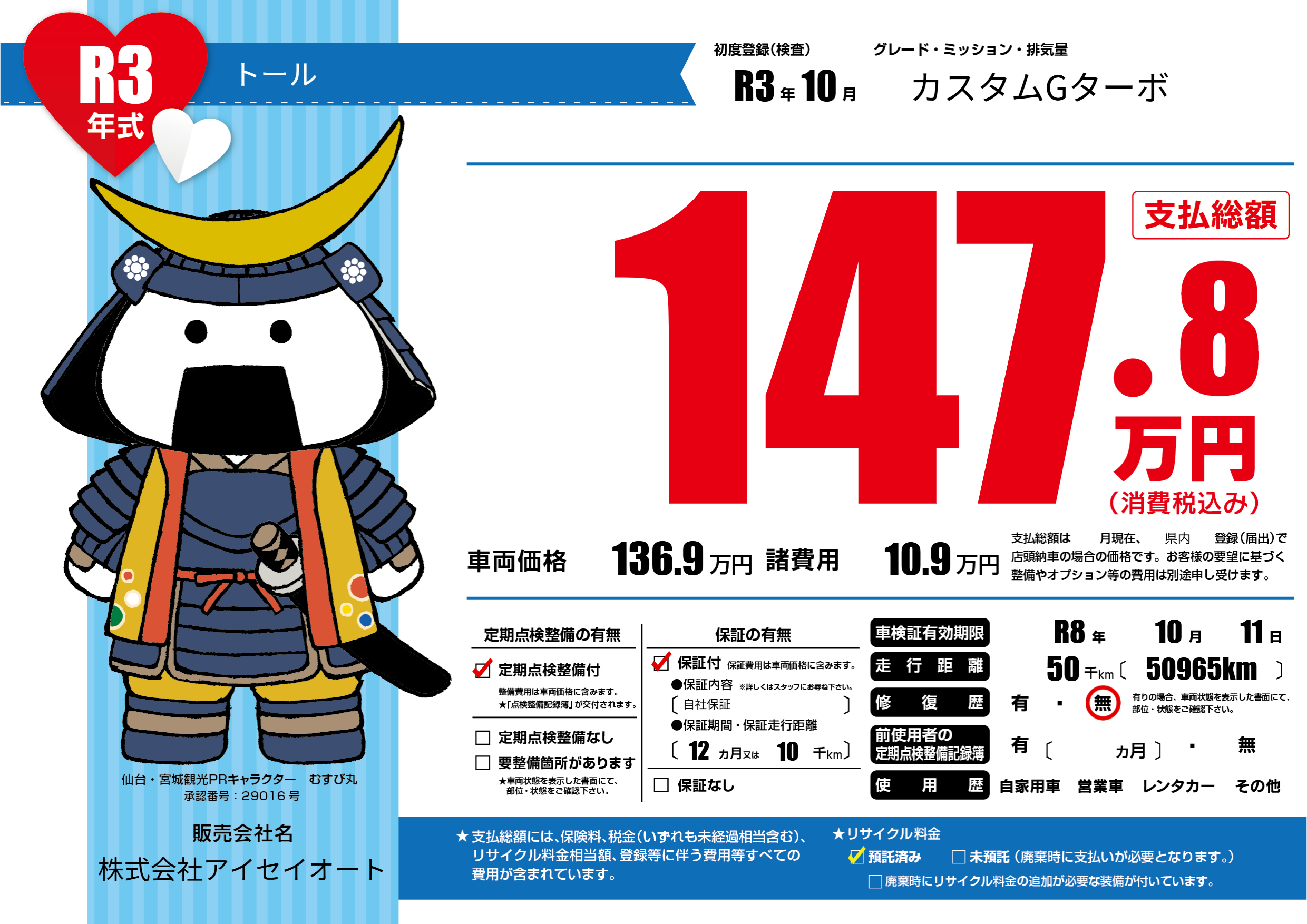 | 走行キロ | 5万km | 初年度登録 | R3年10月 |