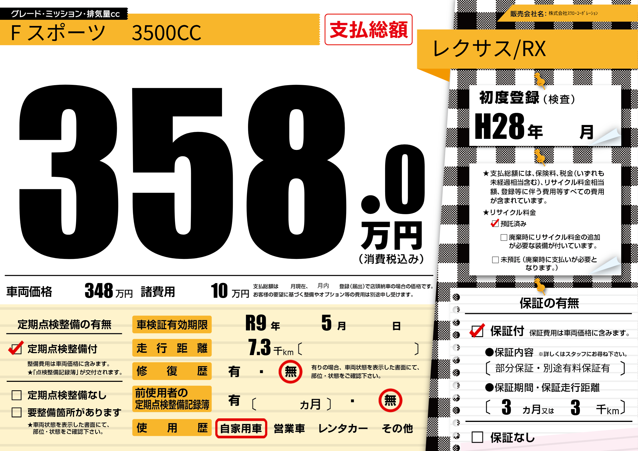 | 車名 | レクサス/RX | グレード ミッション 排気量 |