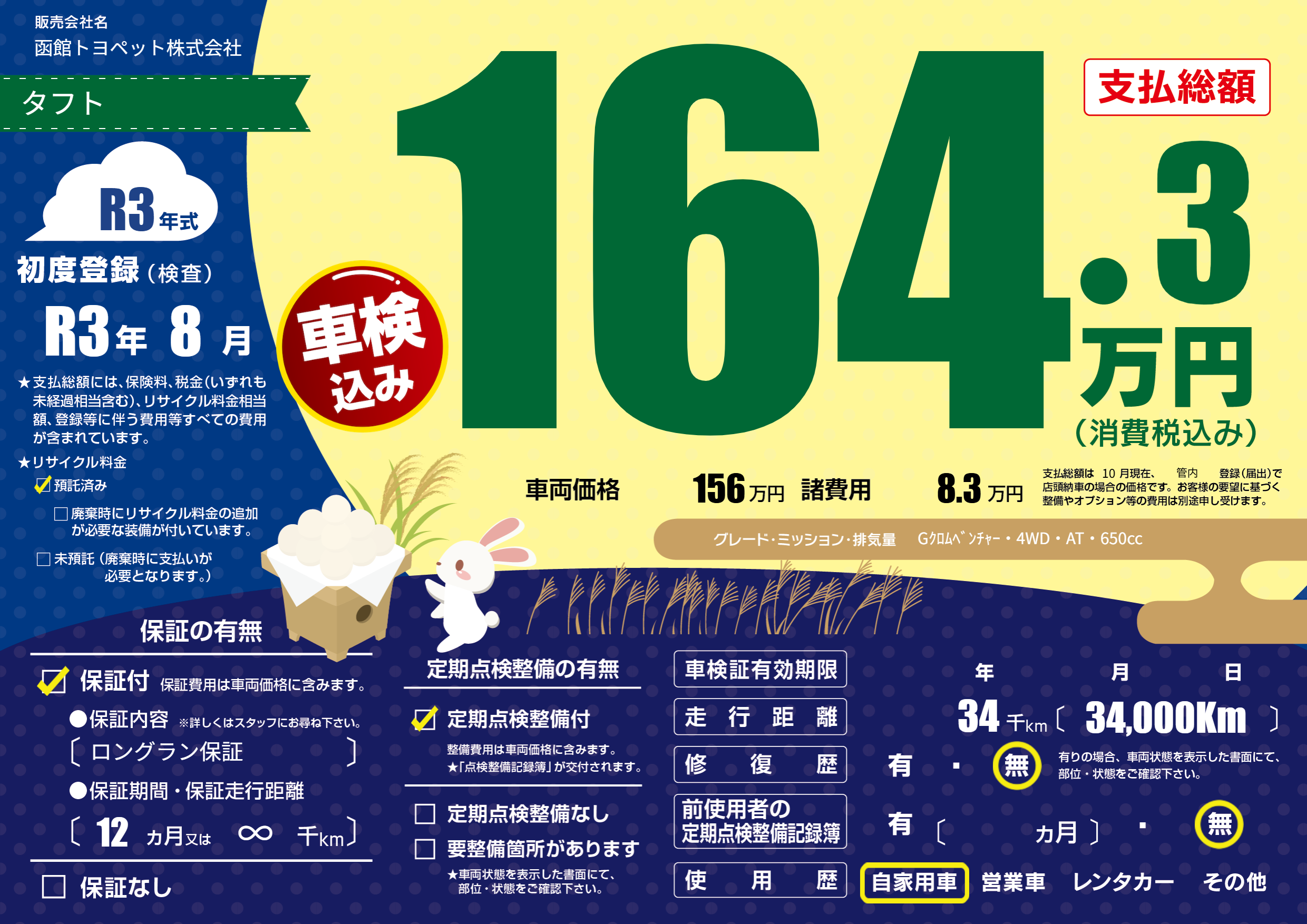 | 走行キロ | 3.4万km | 初年度登録 | R3年8月 |