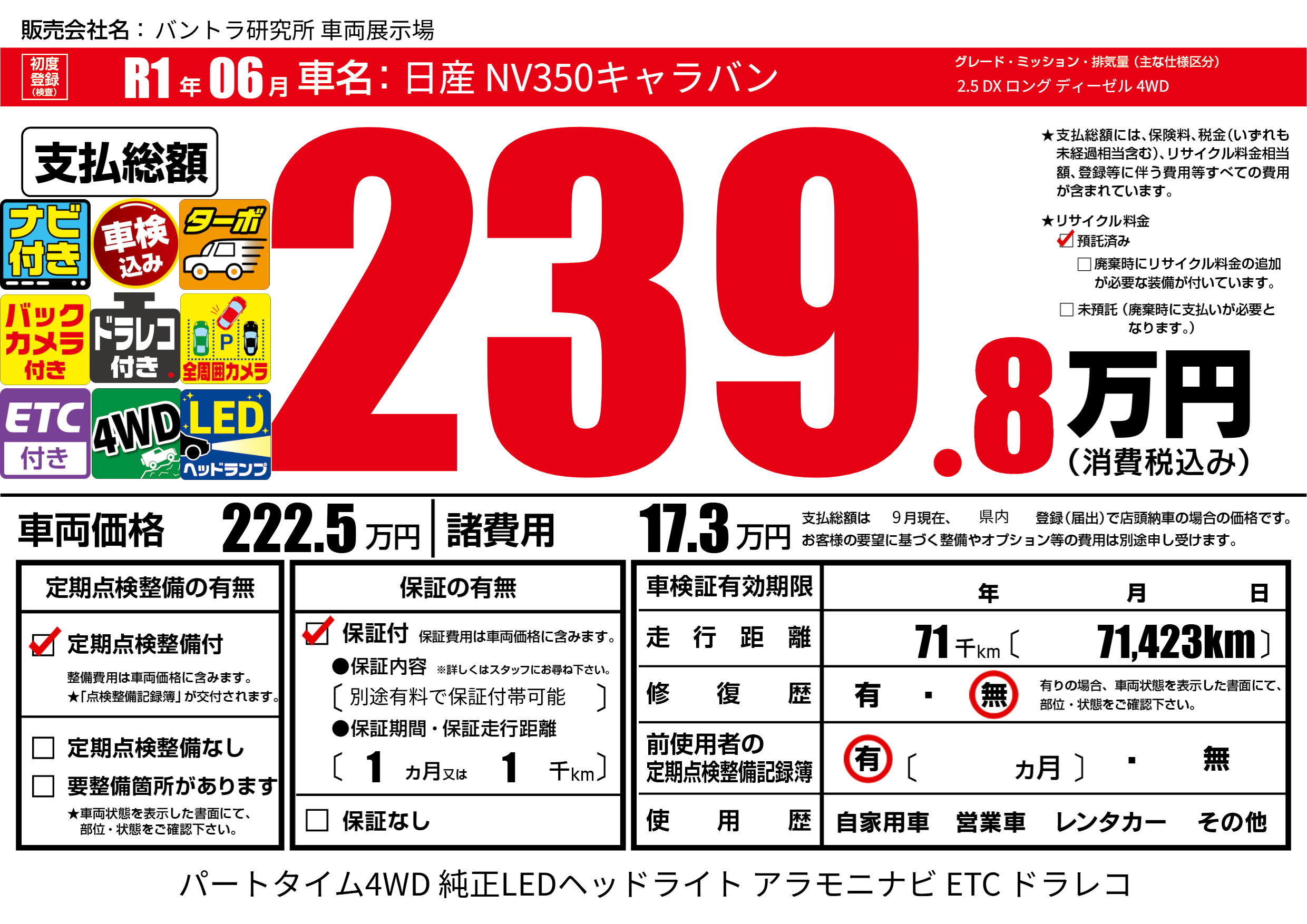 | 車名 | 日産 NV350キャラバン | グレード ミッション 排気量 |