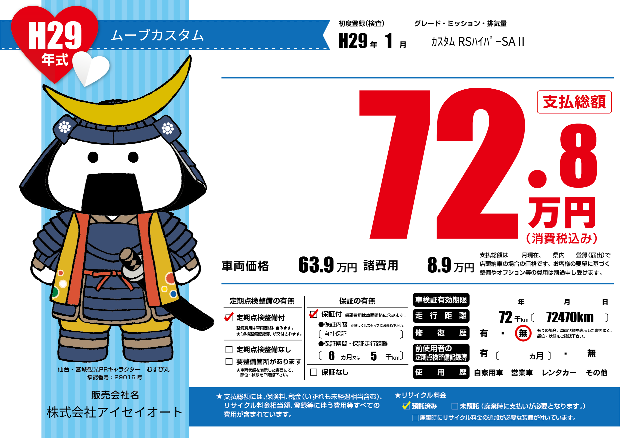 | 車名 | ムーブカスタム | グレード ミッション 排気量 |