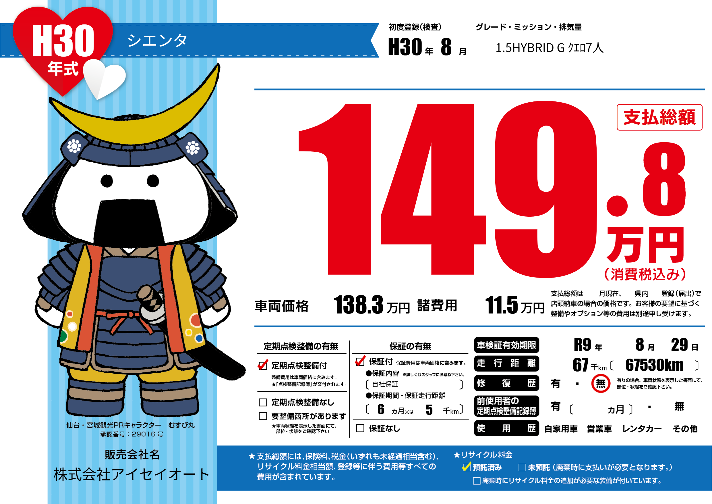 | 車検制限 | R9年 8月 29日 | ||