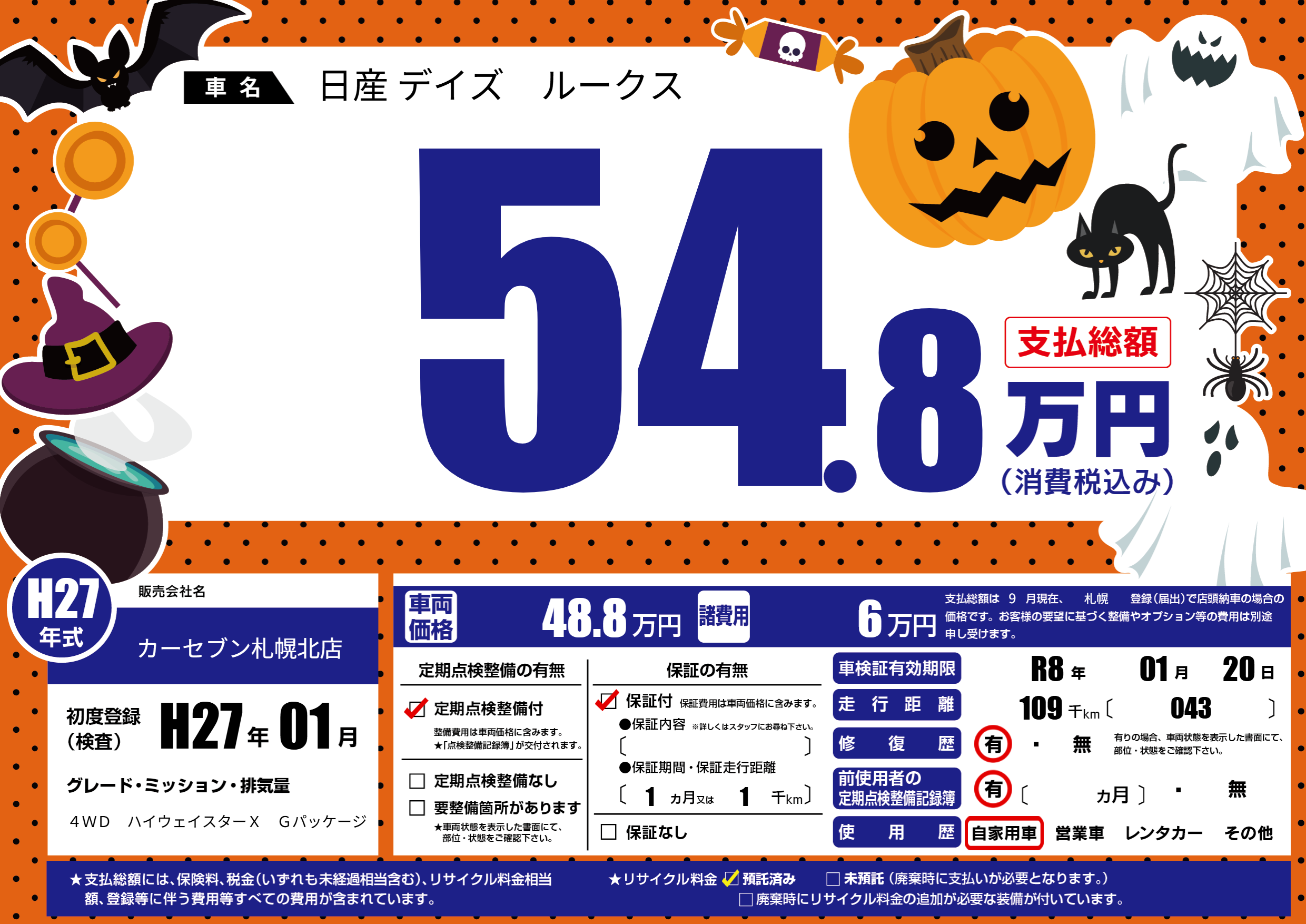 | 走行キロ | 10.9万km | 初年度登録 | H27年01月 |