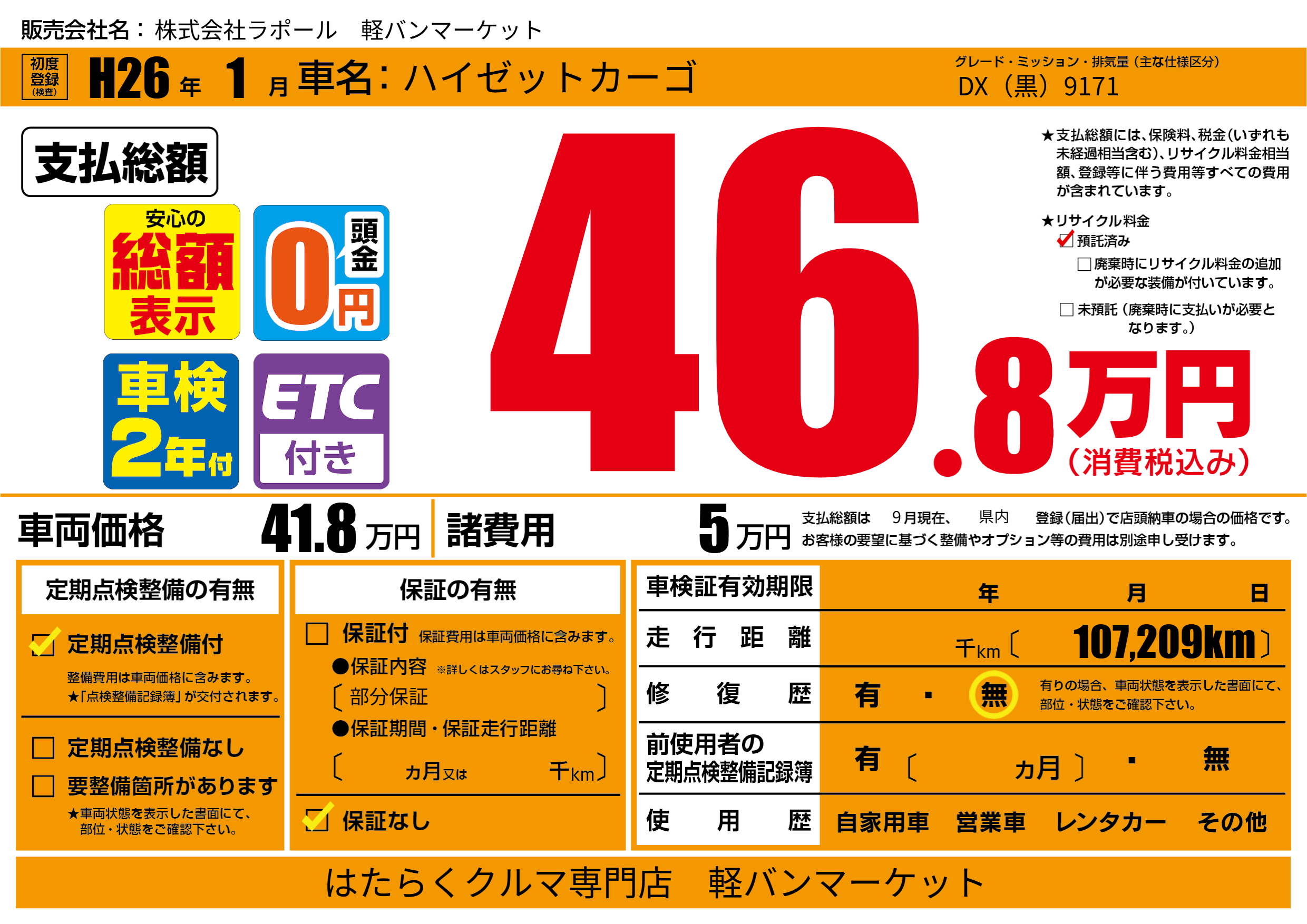 | 車名 | ハイゼットカーゴ | グレード ミッション 排気量 |