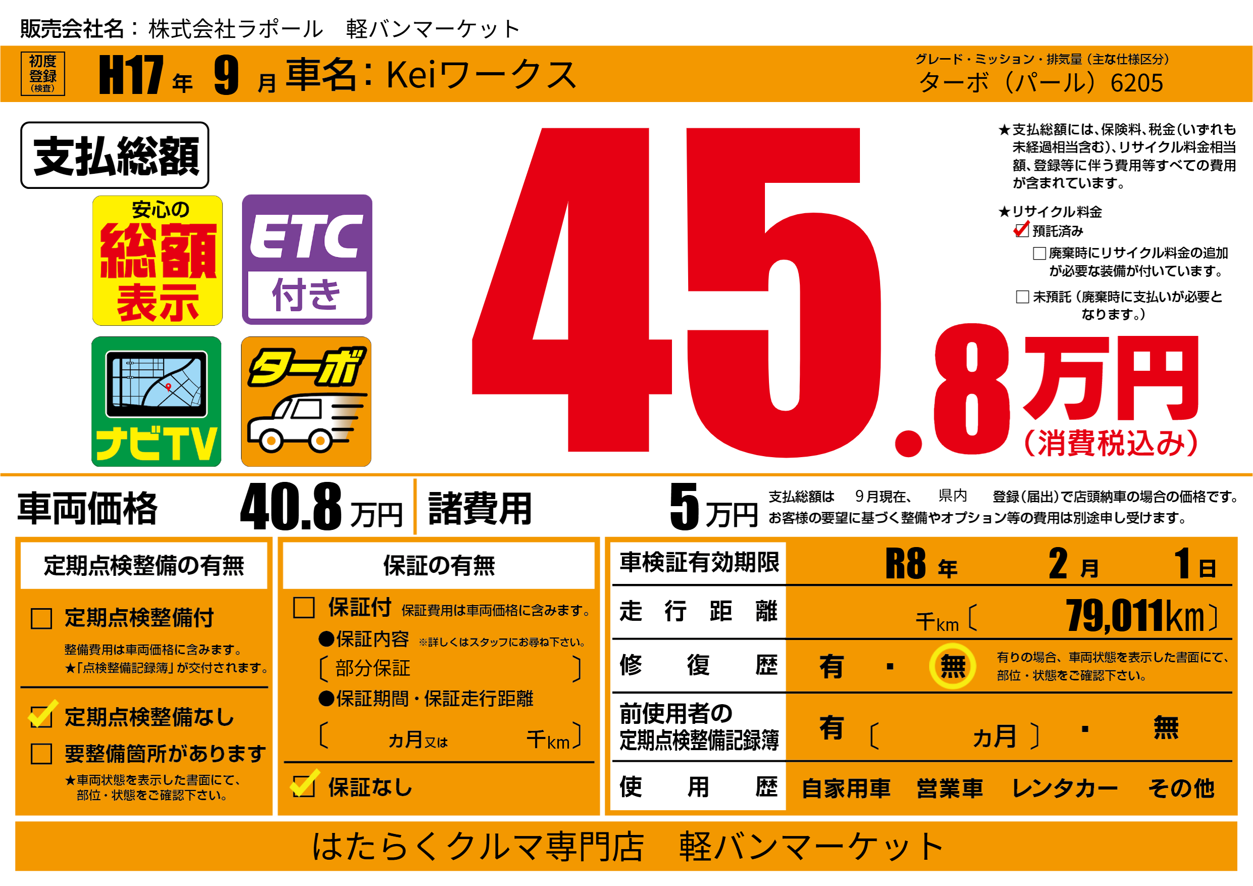 | 走行キロ | - | 初年度登録 | H17年9月 |