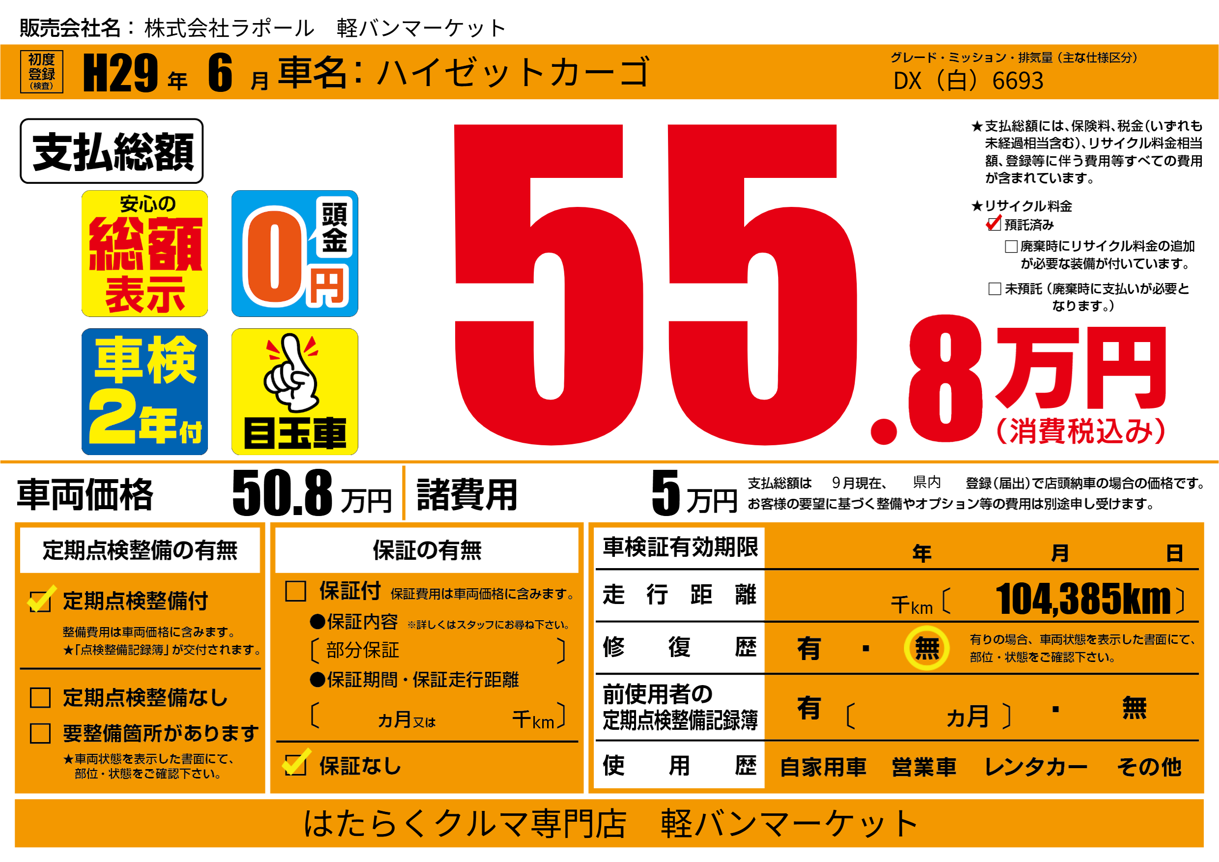 保証なし 保証内容(部分保証) ---ヶ月または()千kmまで |