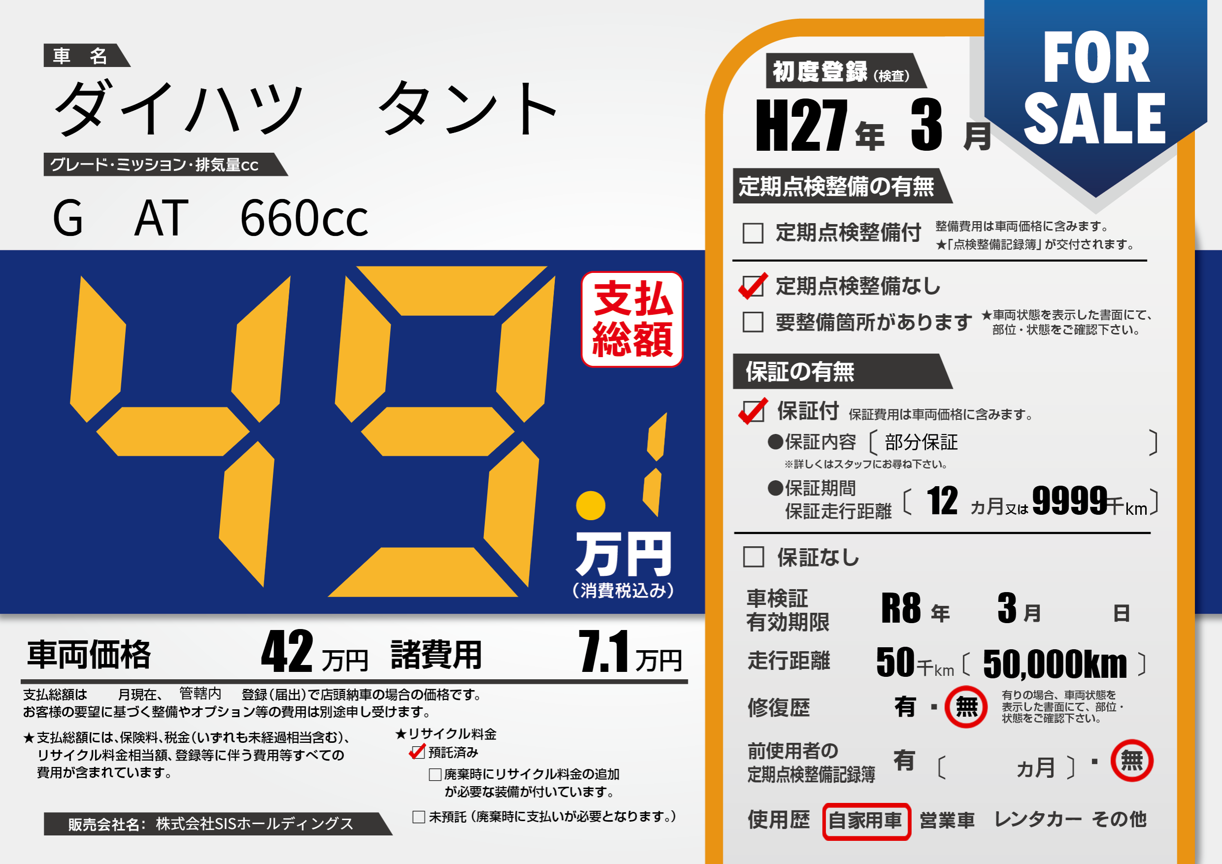 | 走行キロ | 5万km | 初年度登録 | H27年3月 |
