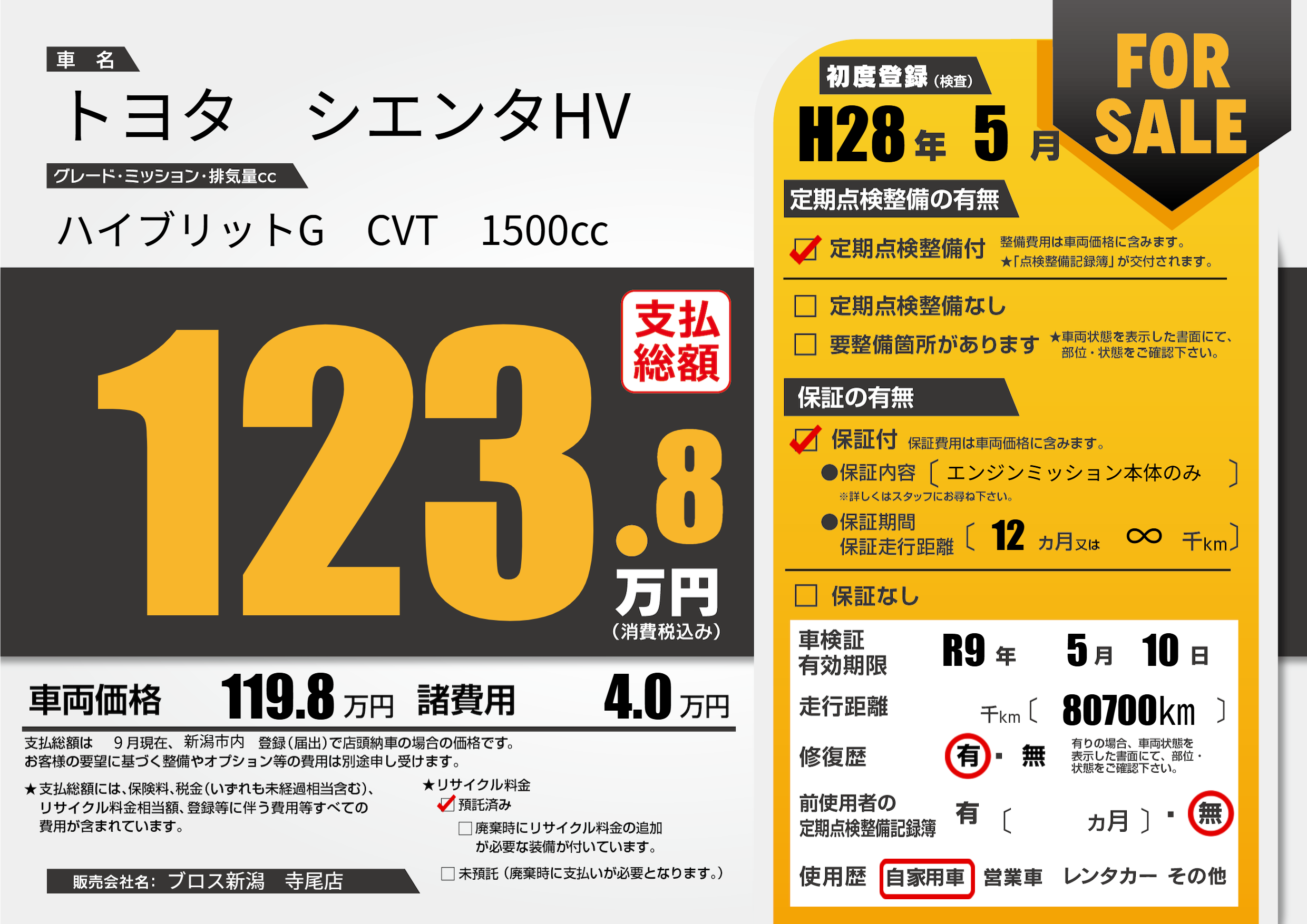 | 車名 | トヨタ シエンタHV | グレード ミッション 排気量 |
