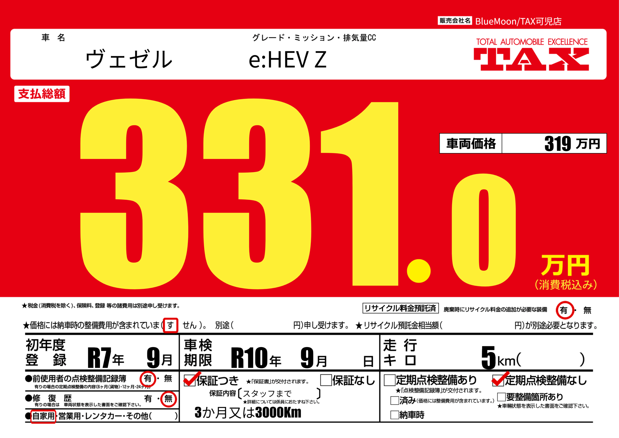 | 走行キロ | 0.5万km | 初年度登録 | R7年9月 |