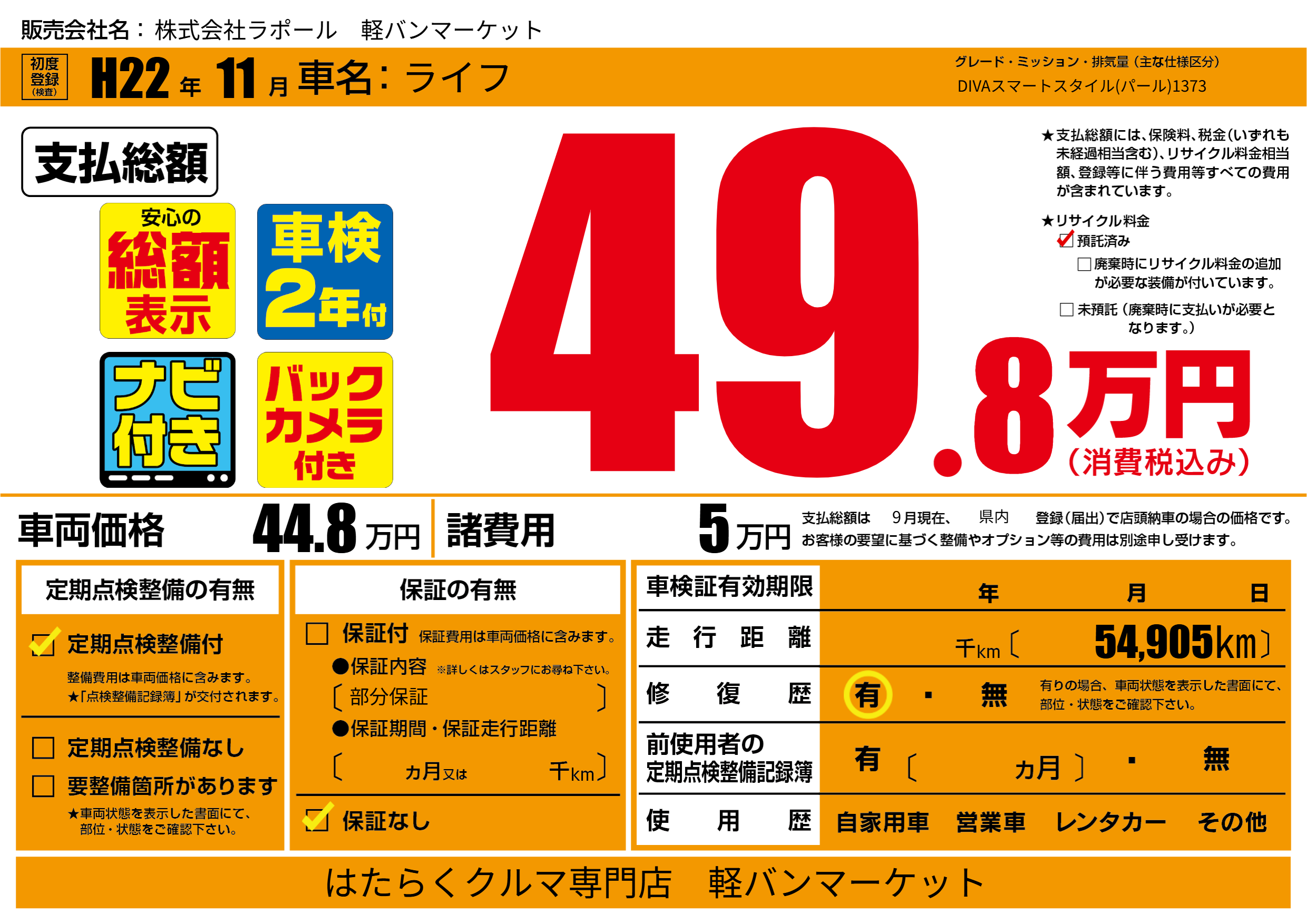 | 走行キロ | - | 初年度登録 | H22年11月 |