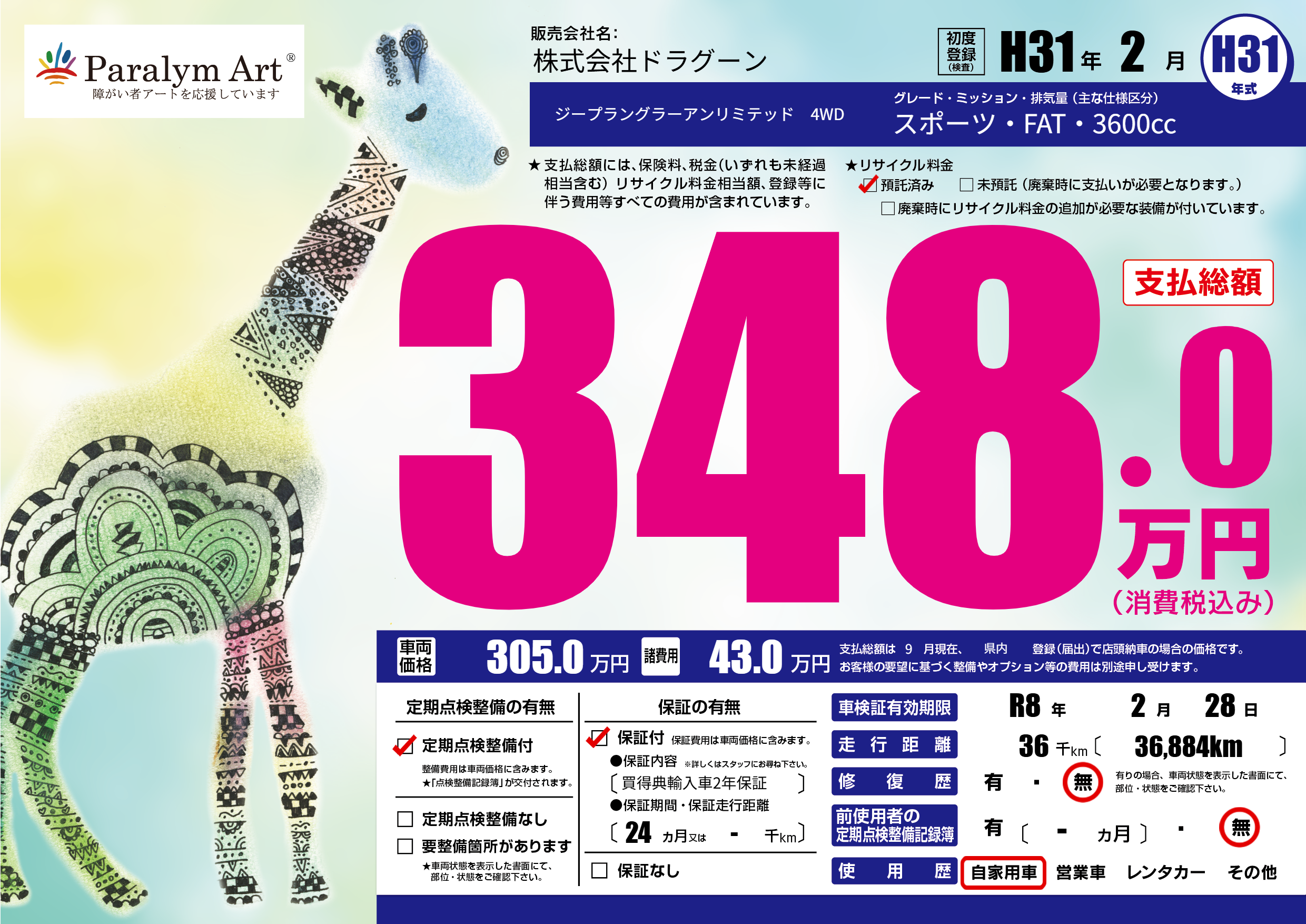 | 車名 | ジープラングラーアンリミテッド 4WD | グレード ミッション 排気量 |