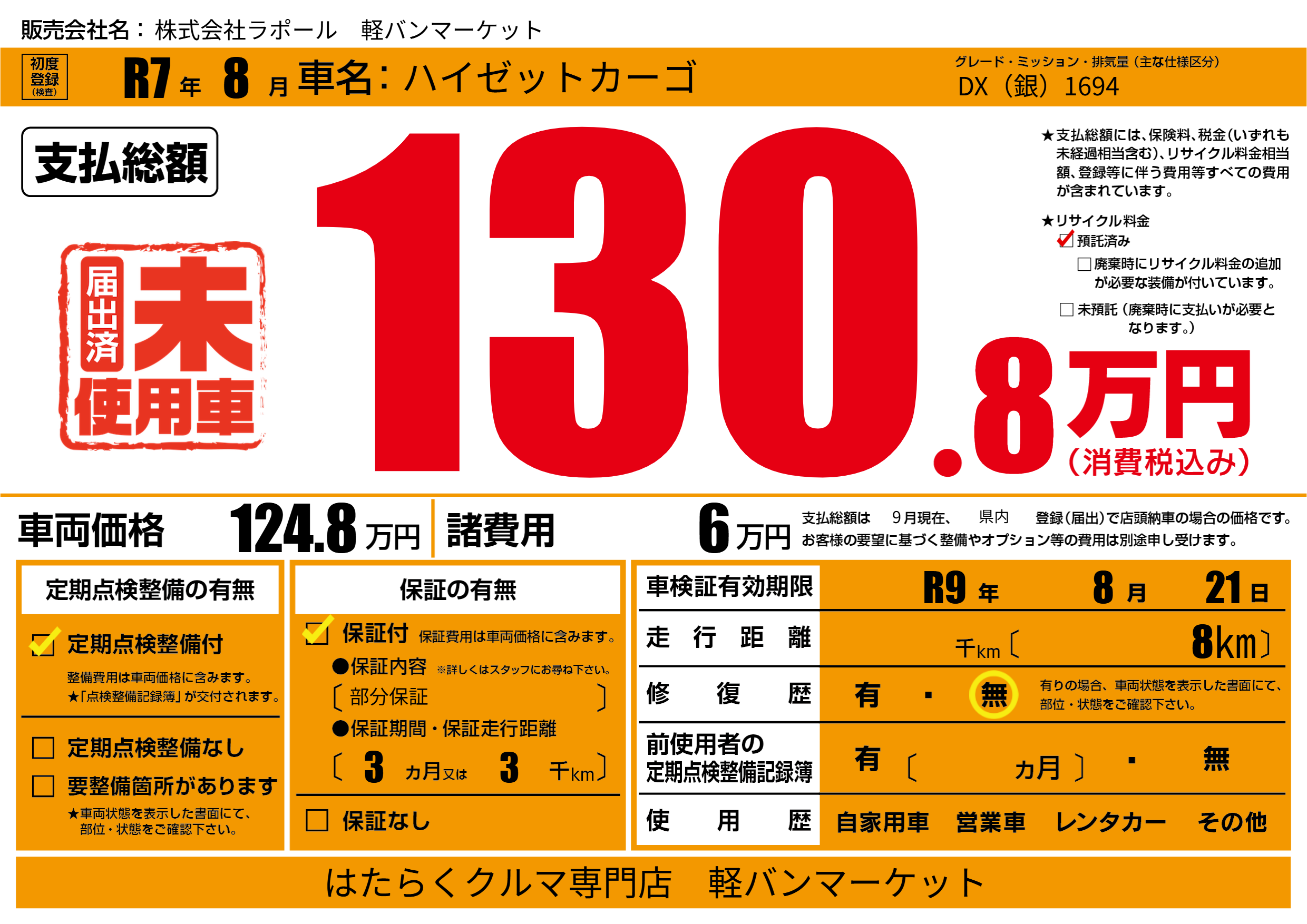 なし | 車検制限 | R9年8月21月 |