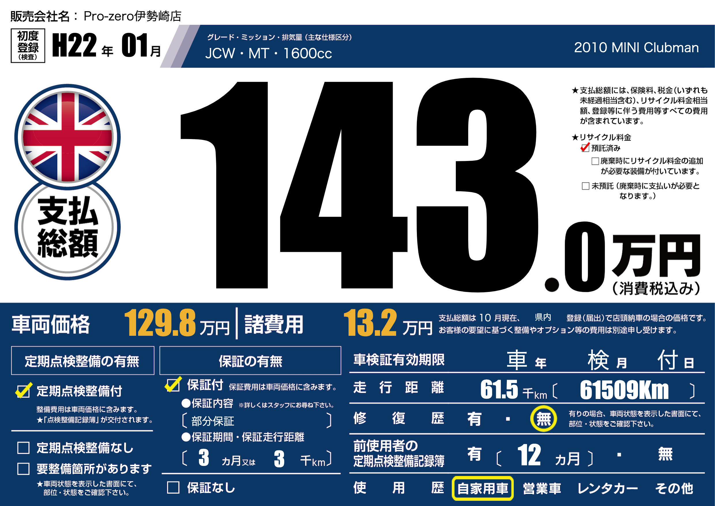 | 車名 | 2010 MINI Clubman | グレード ミッション 排気量 |