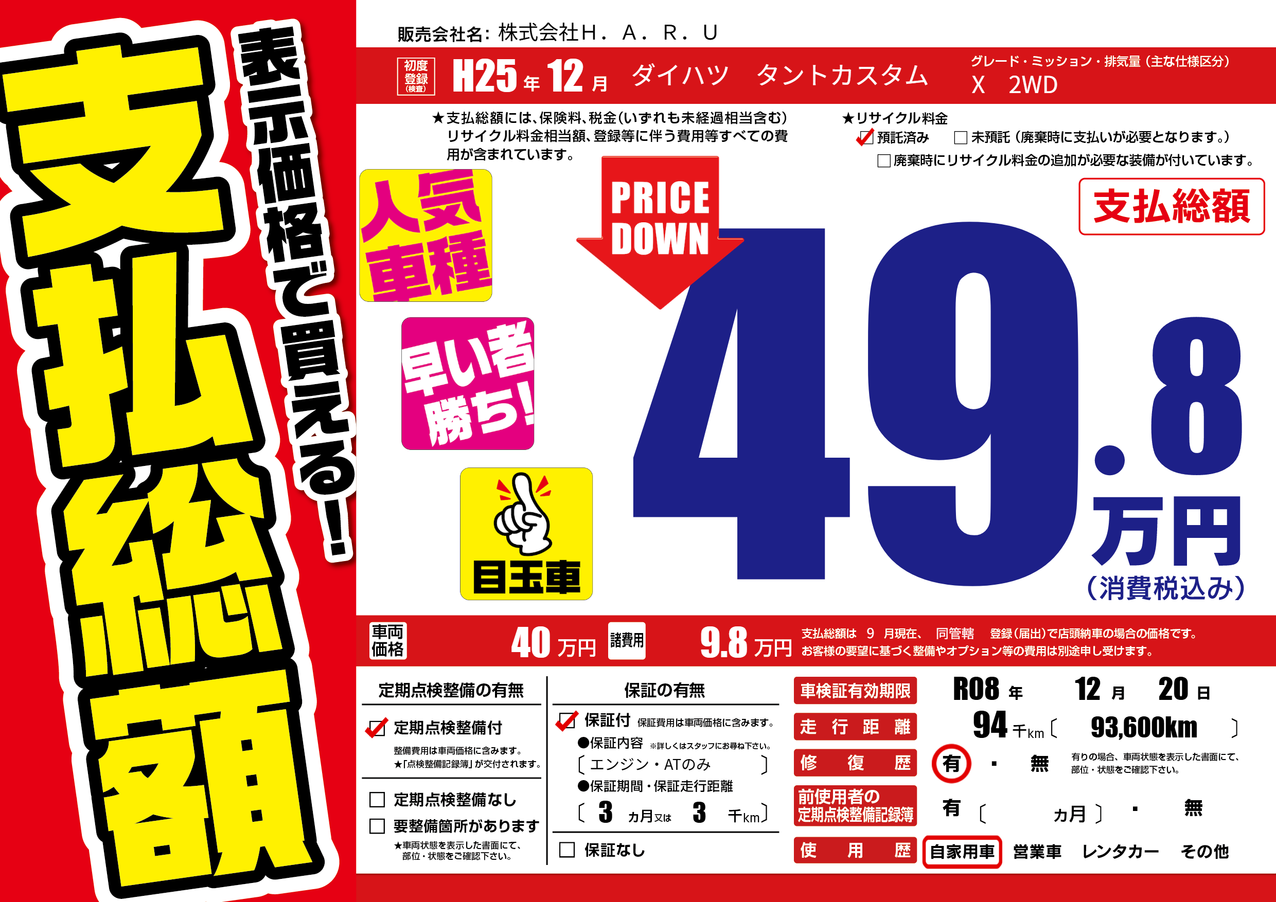 | 走行キロ | 9.4万km | 初年度登録 | H25年12月 |