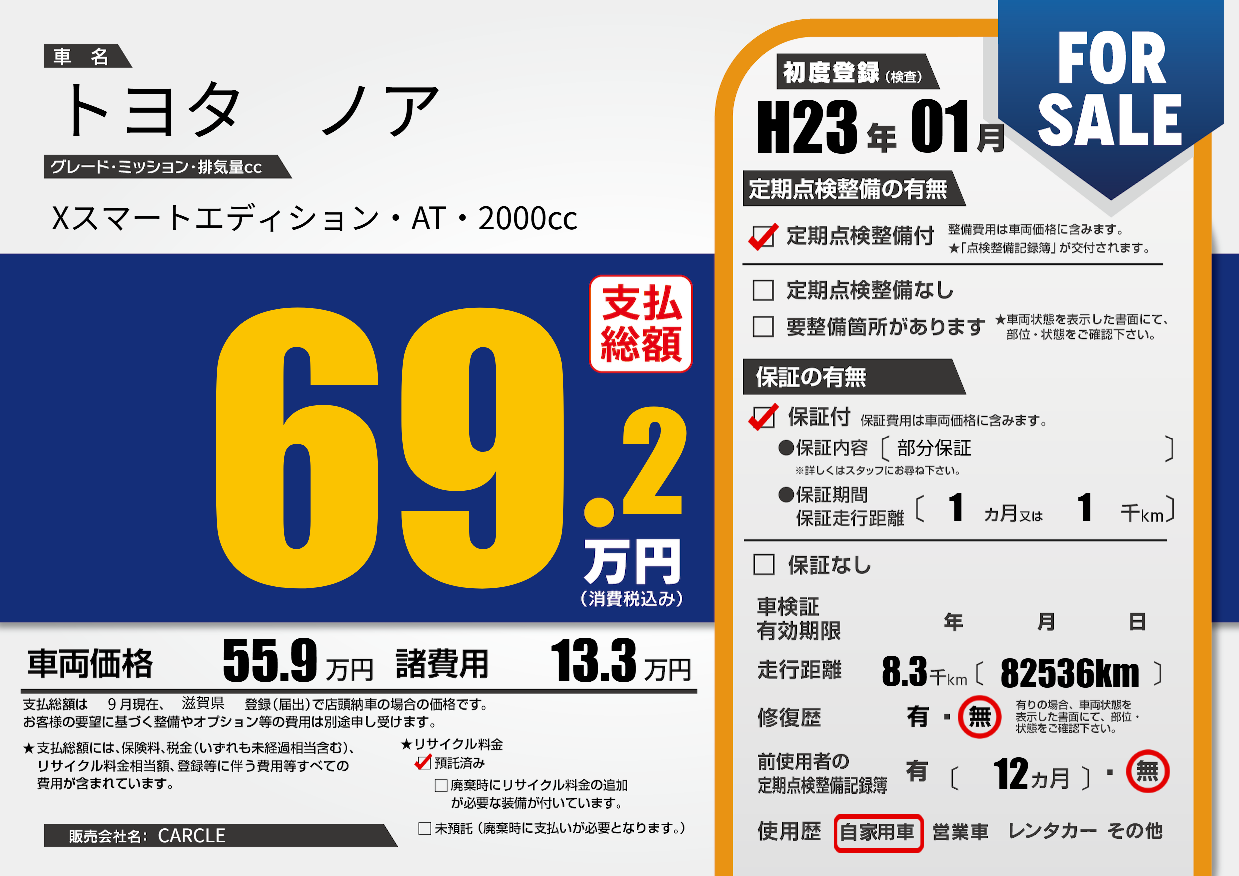 | 走行キロ | 0.8万km | 初年度登録 | H23年01月 |