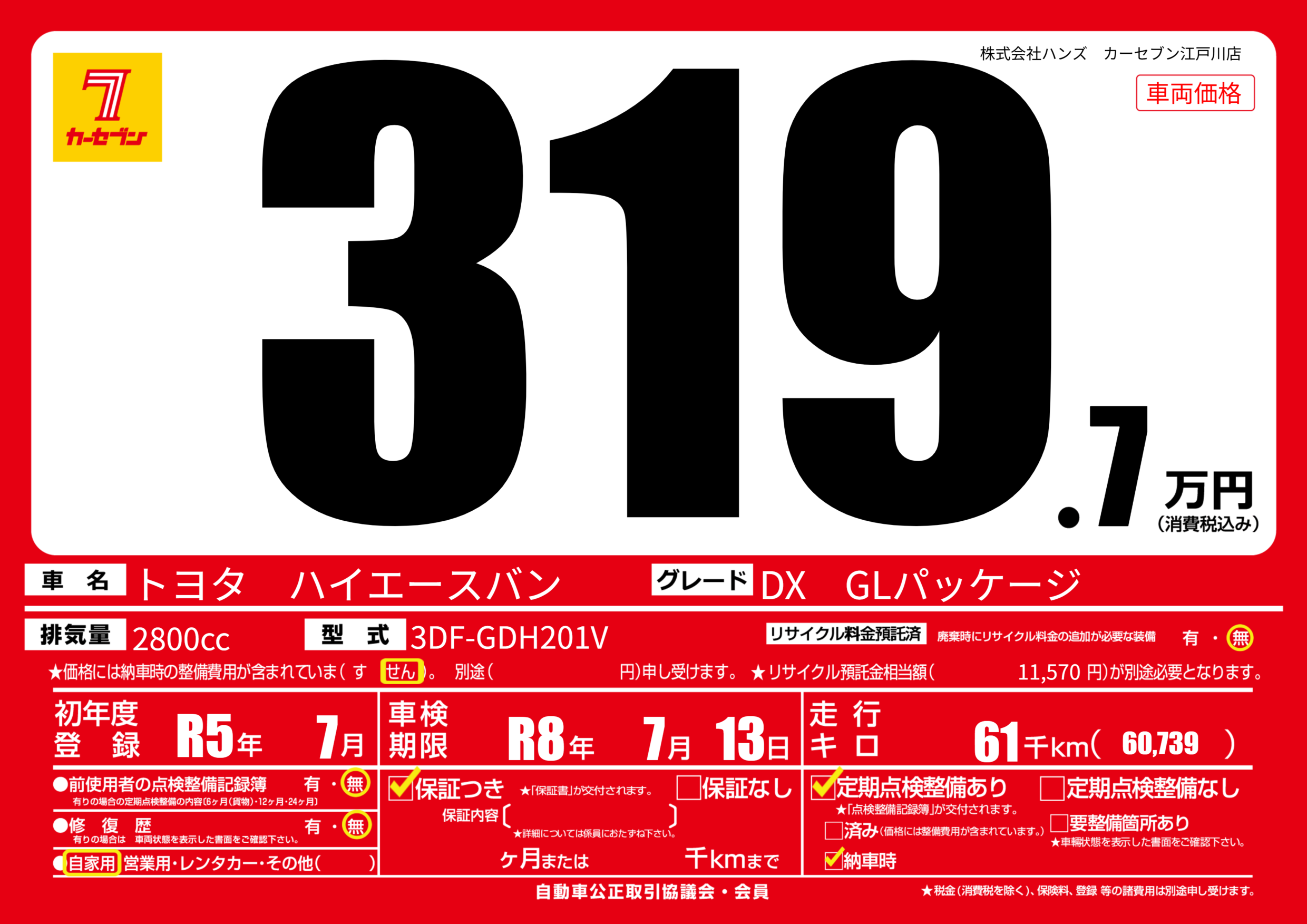 | 車名 | トヨタ ハイエースバン | グレード ミッション 排気量 |
