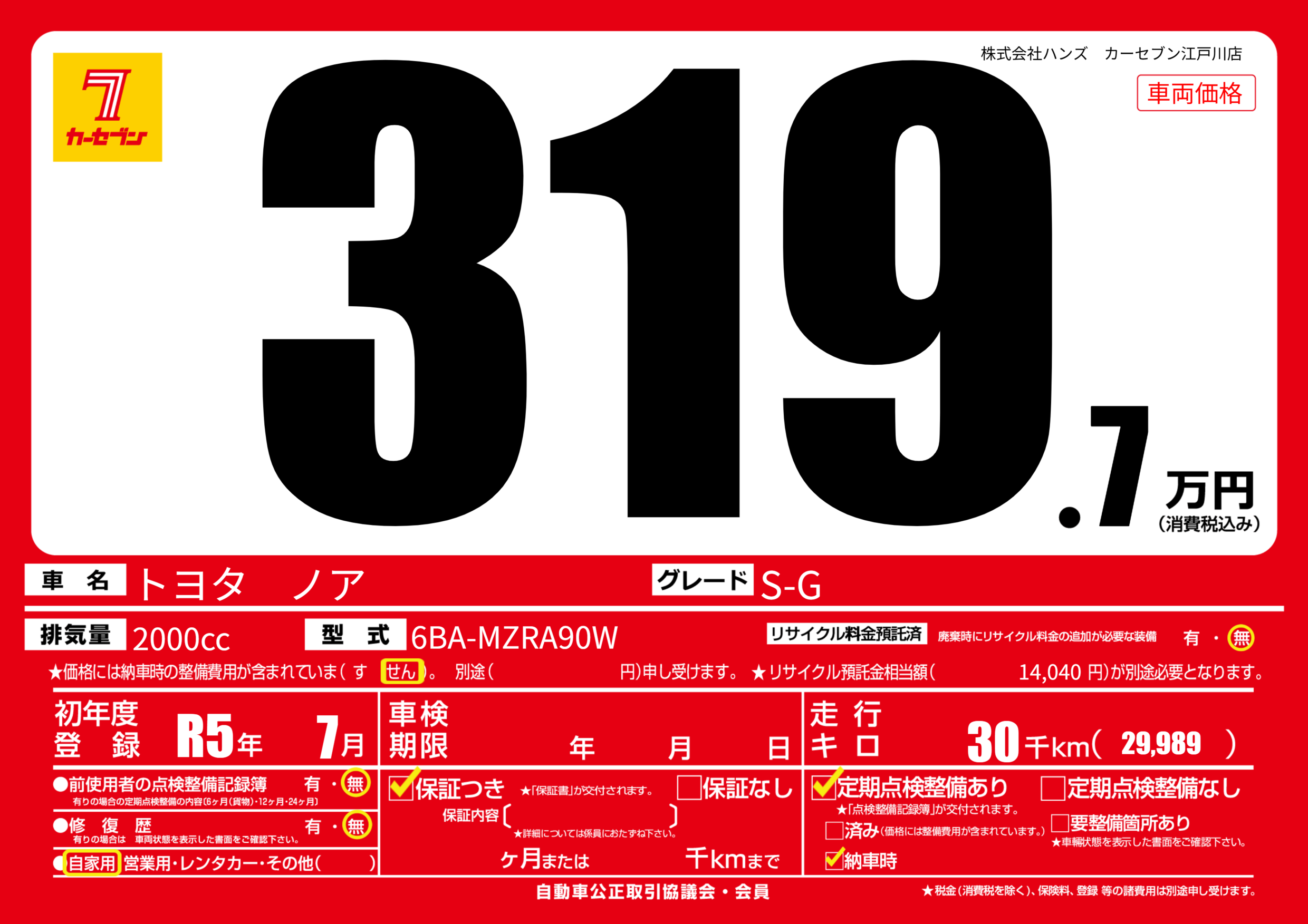 | 走行キロ | 3万km | 初年度登録 | R5年7月 |