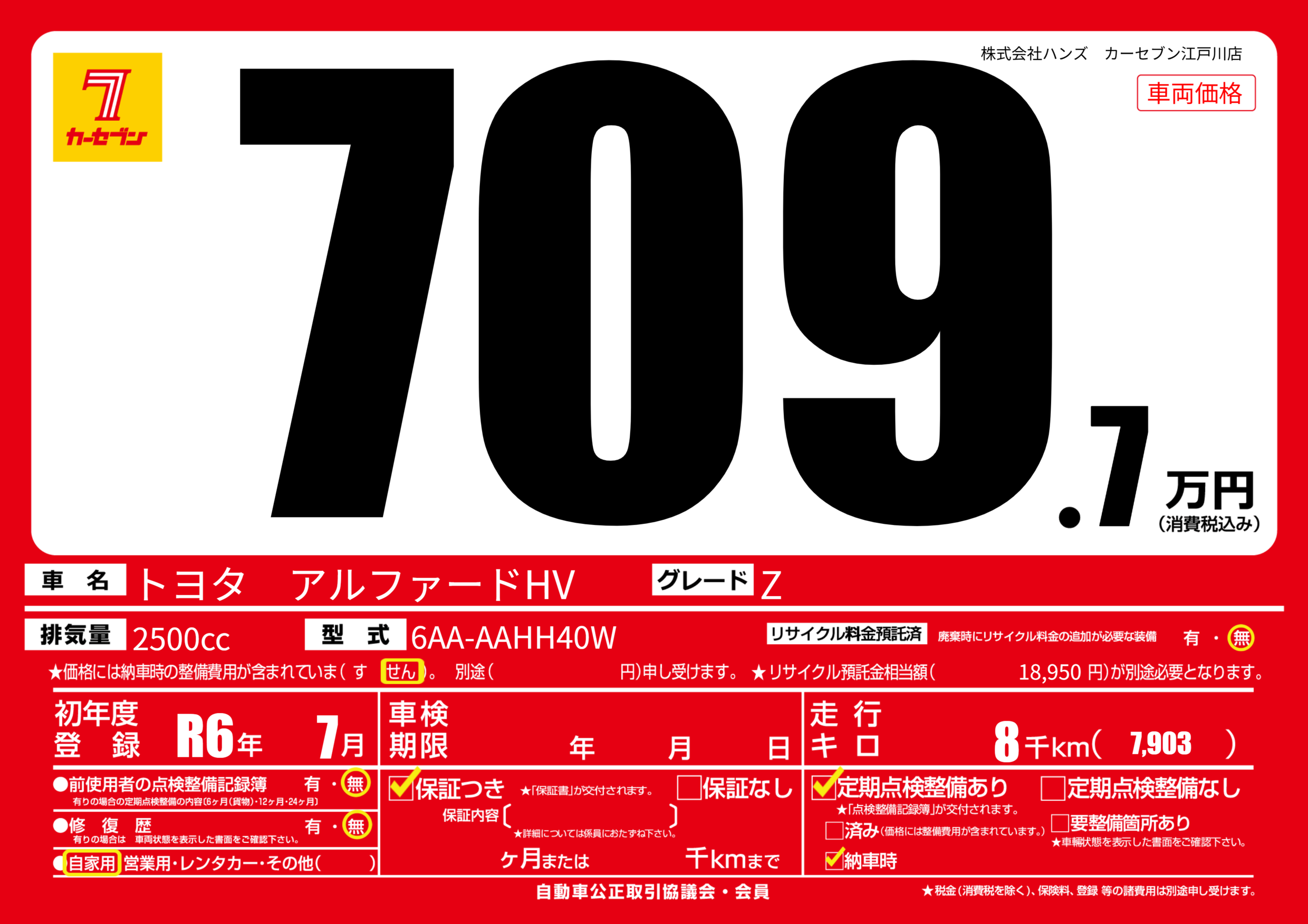 | 走行キロ | 0.8万km | 初年度登録 | R6年7月 |
