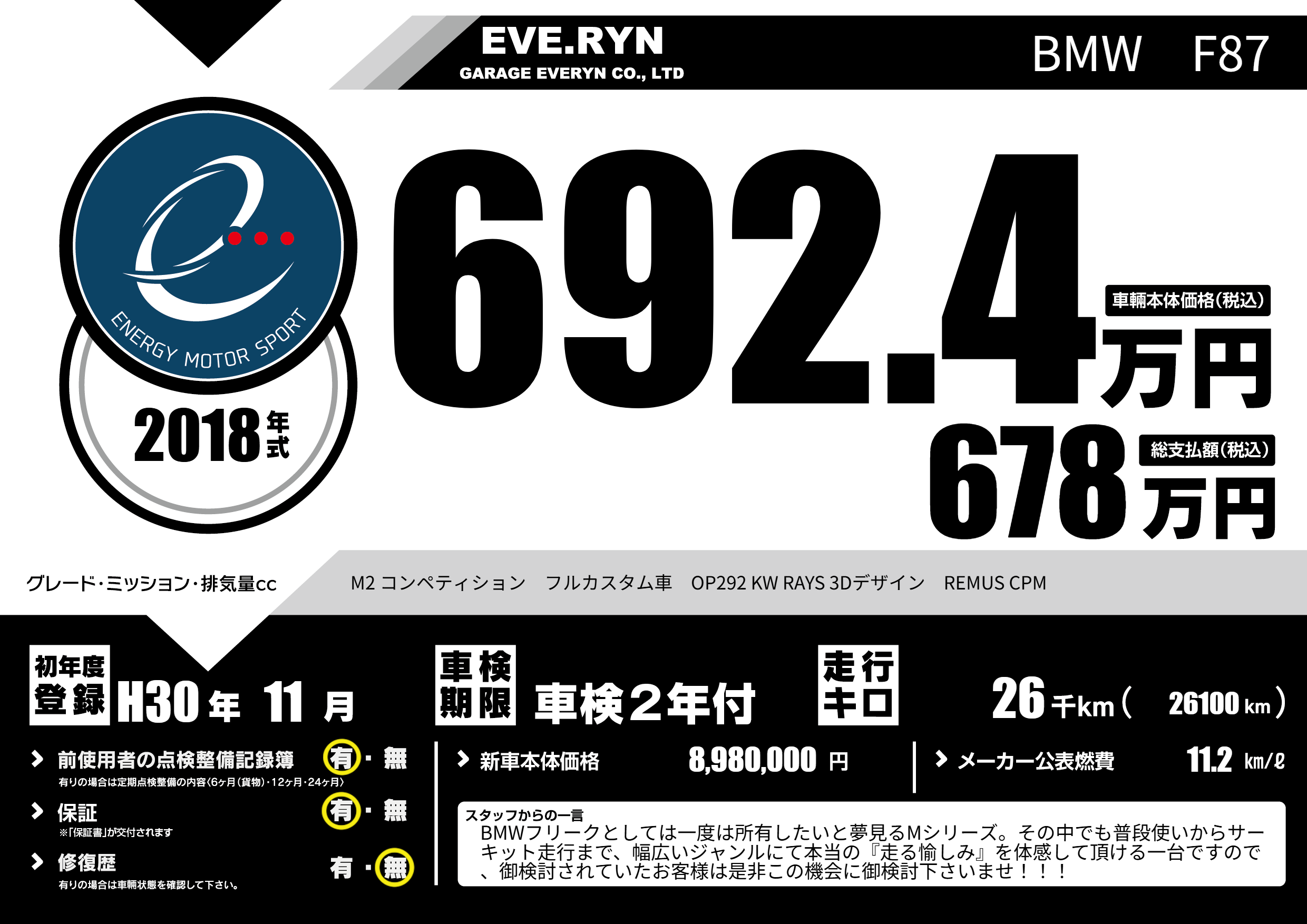 | 車名 | BMW F87 | グレード ミッション 排気量 |