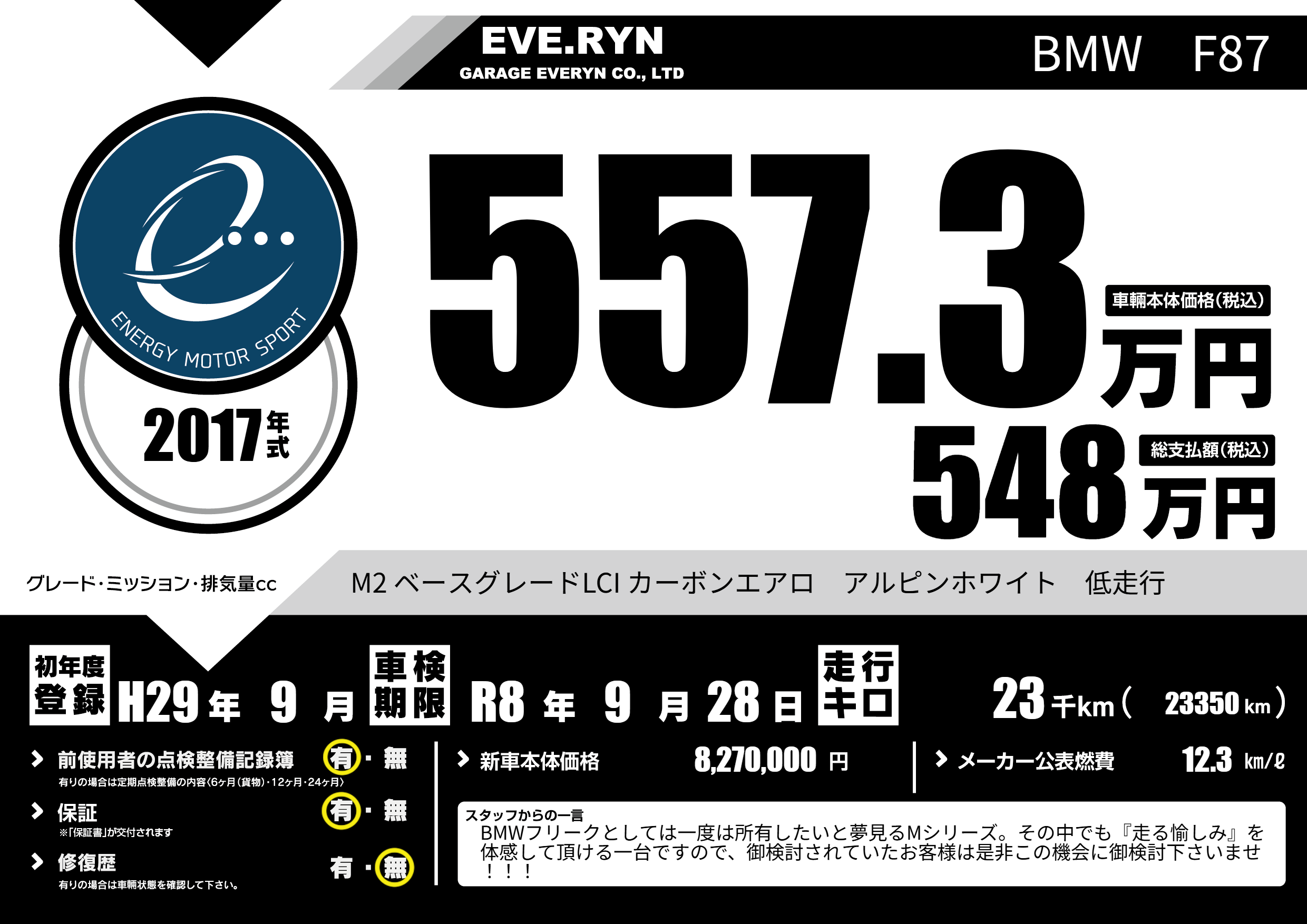 | 車名 | BMW F87 | グレード ミッション 排気量 |