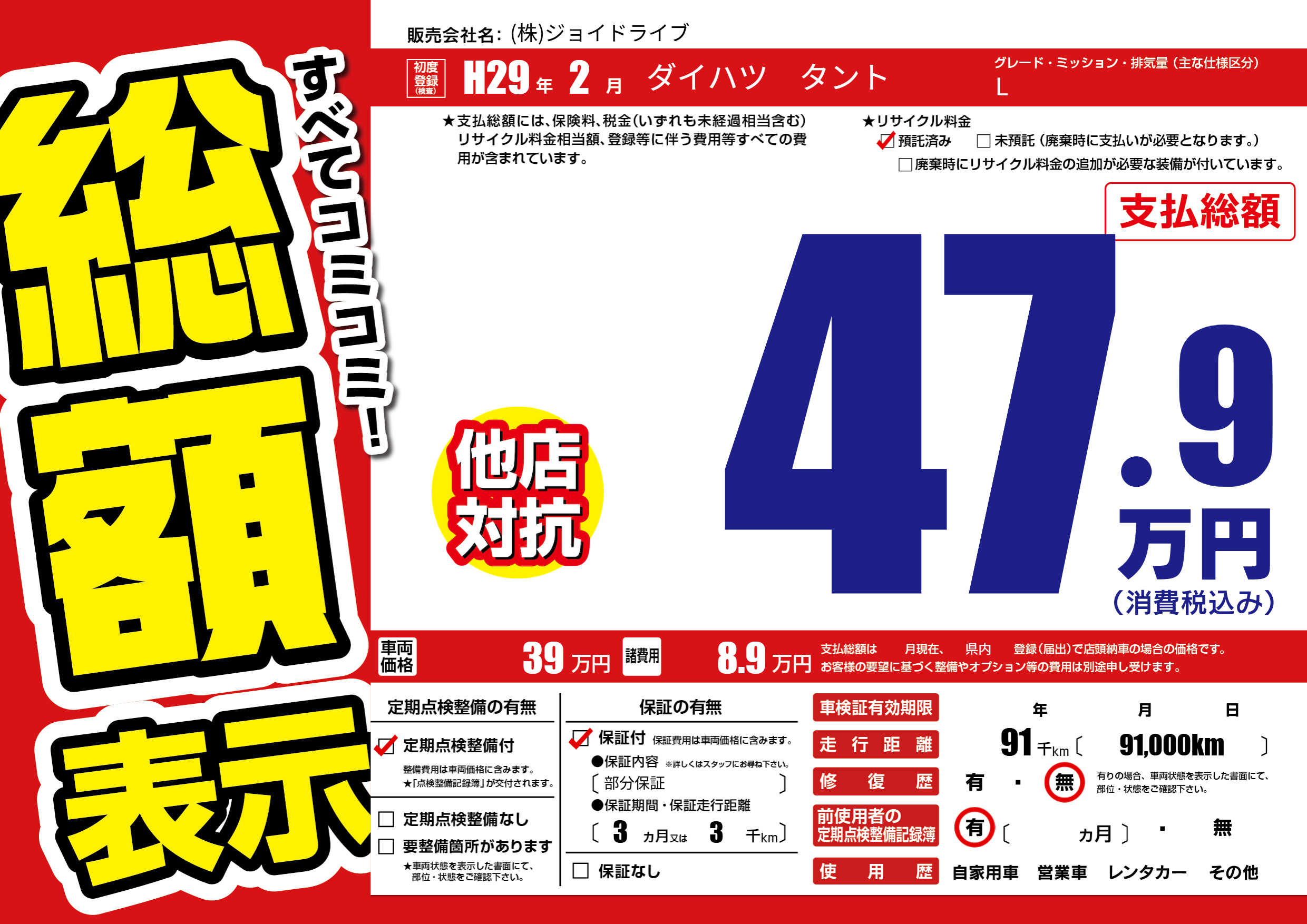 | 走行キロ | 9.1万km | 初年度登録 | H29年2月 |