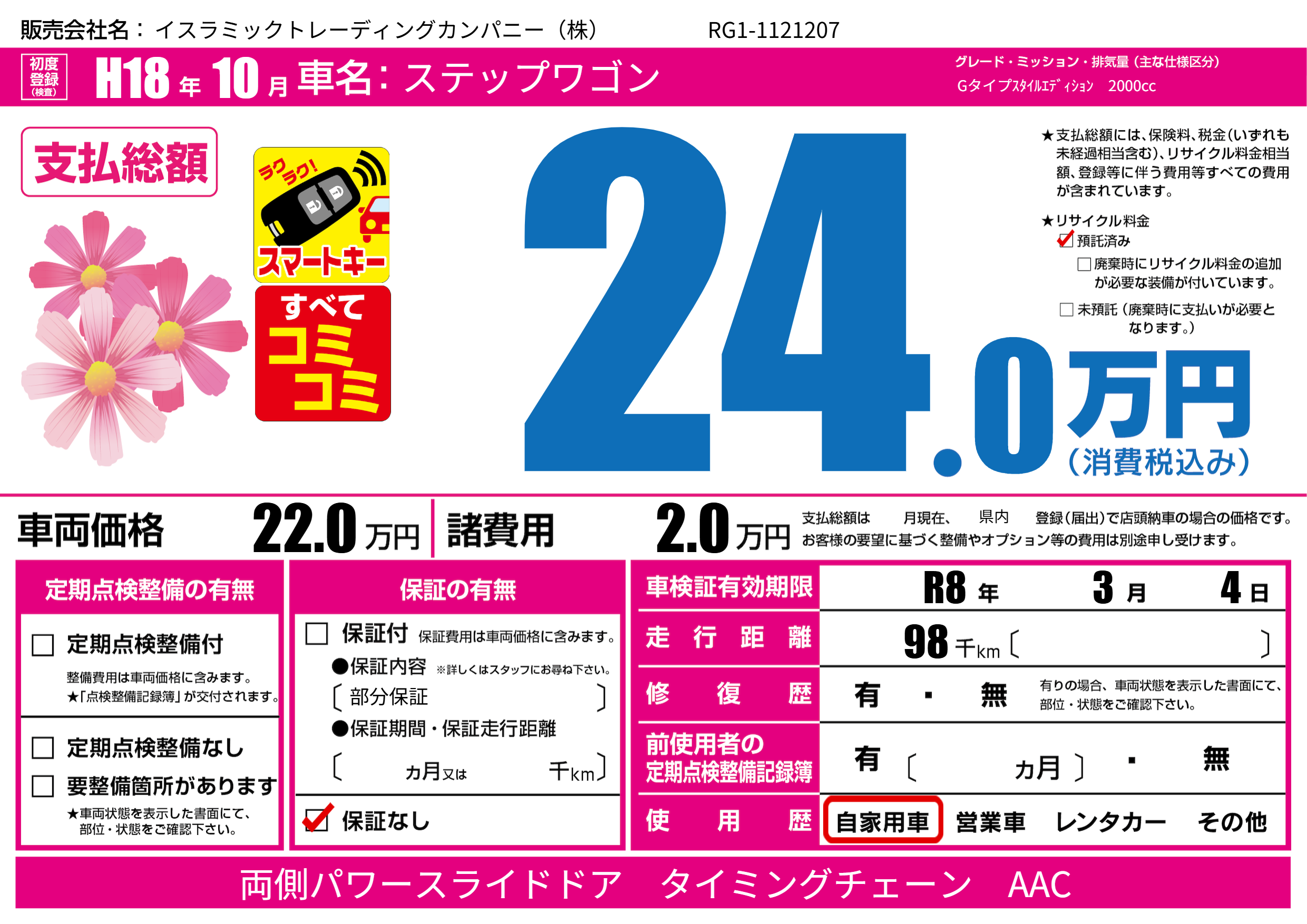 | 車名 | ステップワゴン | グレード ミッション 排気量 |