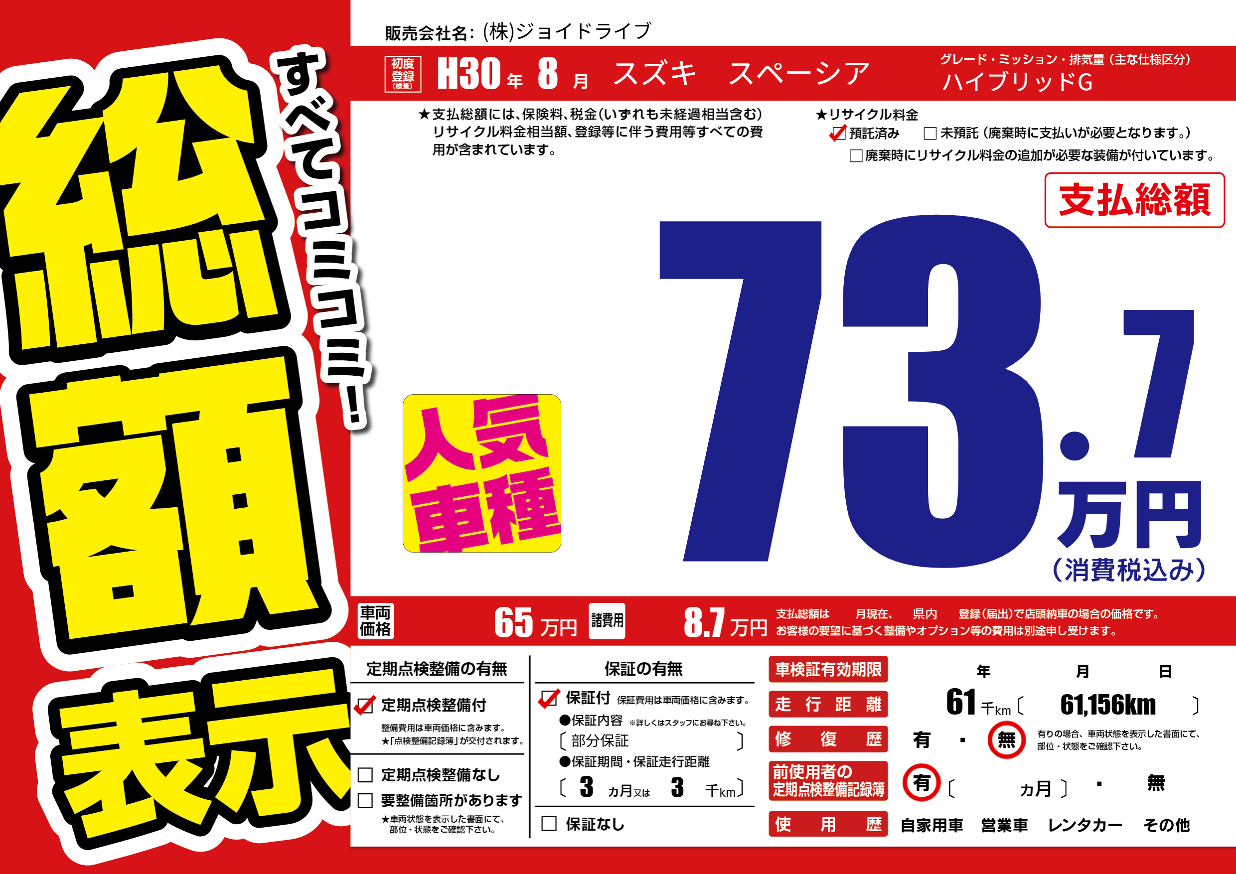 | 走行キロ | 6.1万km | 初年度登録 | H30年8月 |