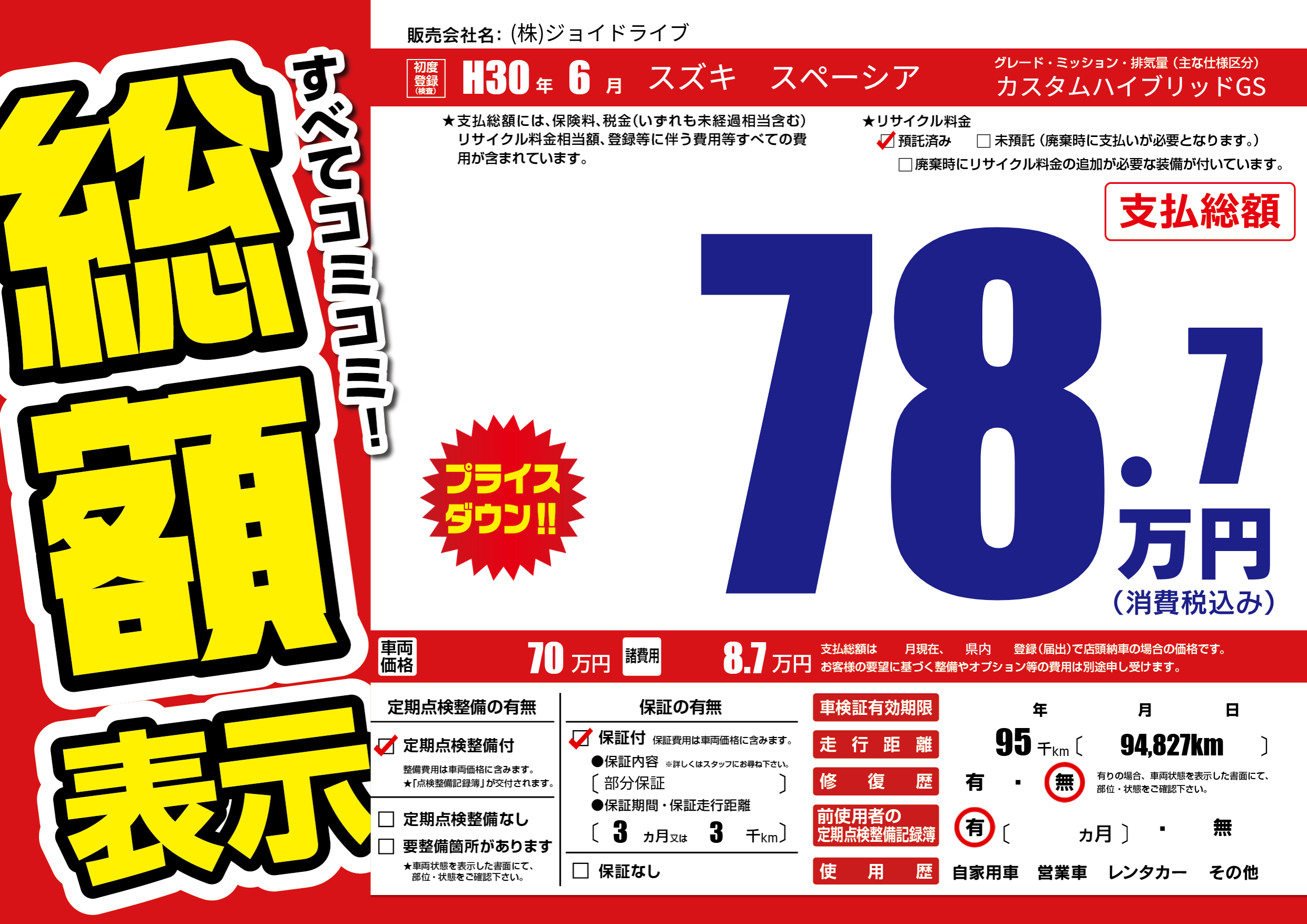 | 走行キロ | 9.5万km | 初年度登録 | H30年6月 |