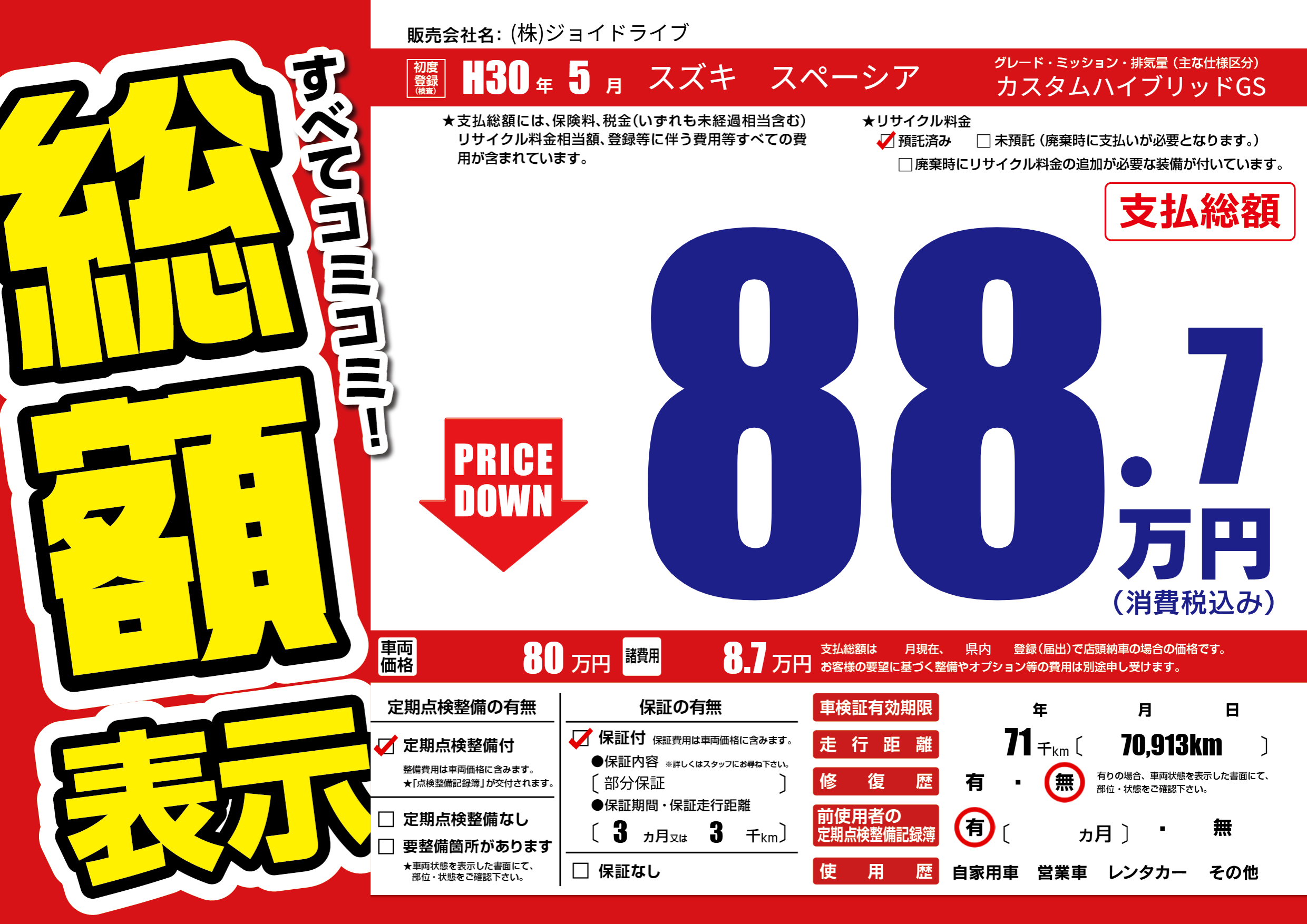 | 走行キロ | 7.1万km | 初年度登録 | H30年5月 |