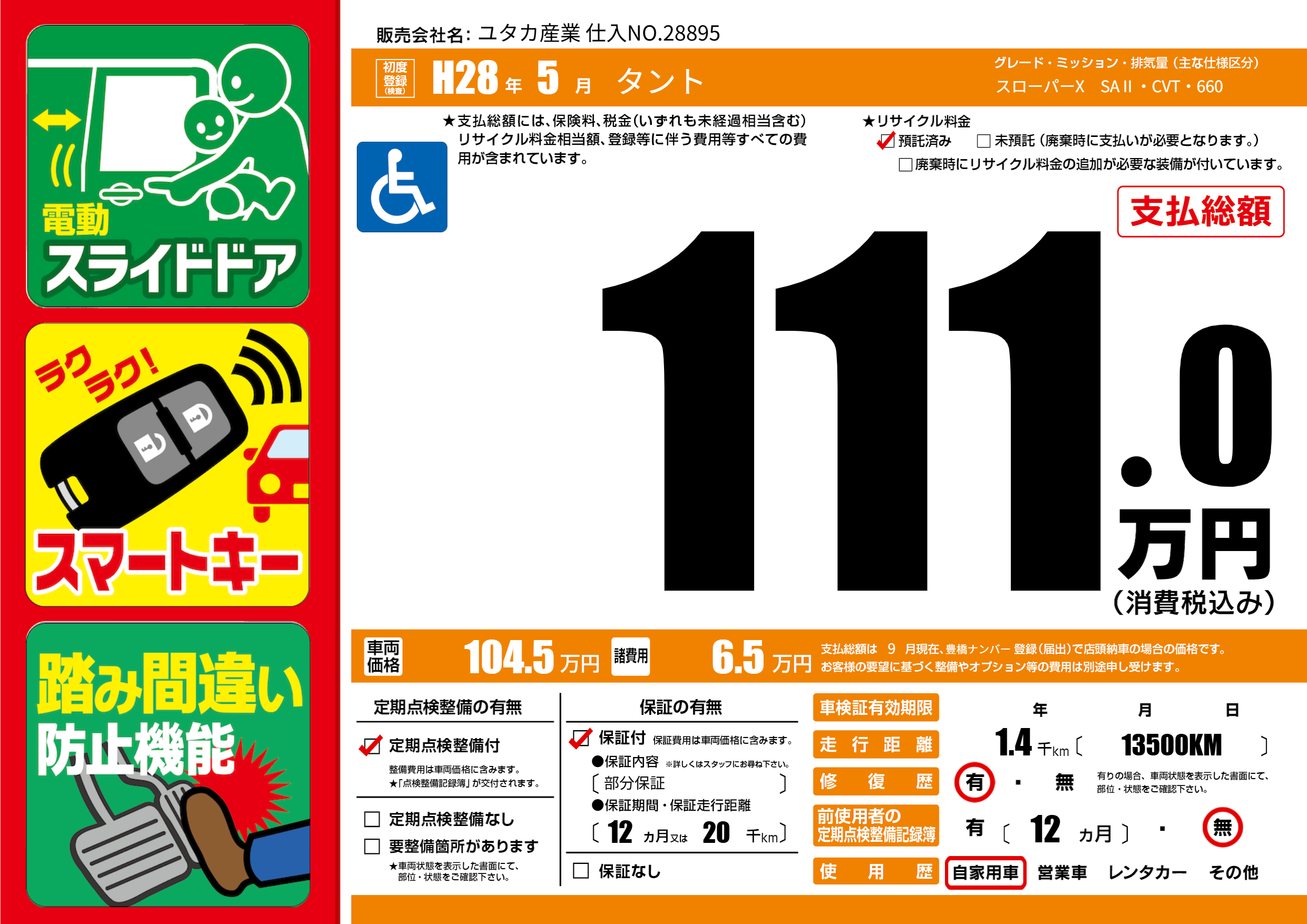 | 走行キロ | 0.1万km | 初年度登録 | H28年5月 |