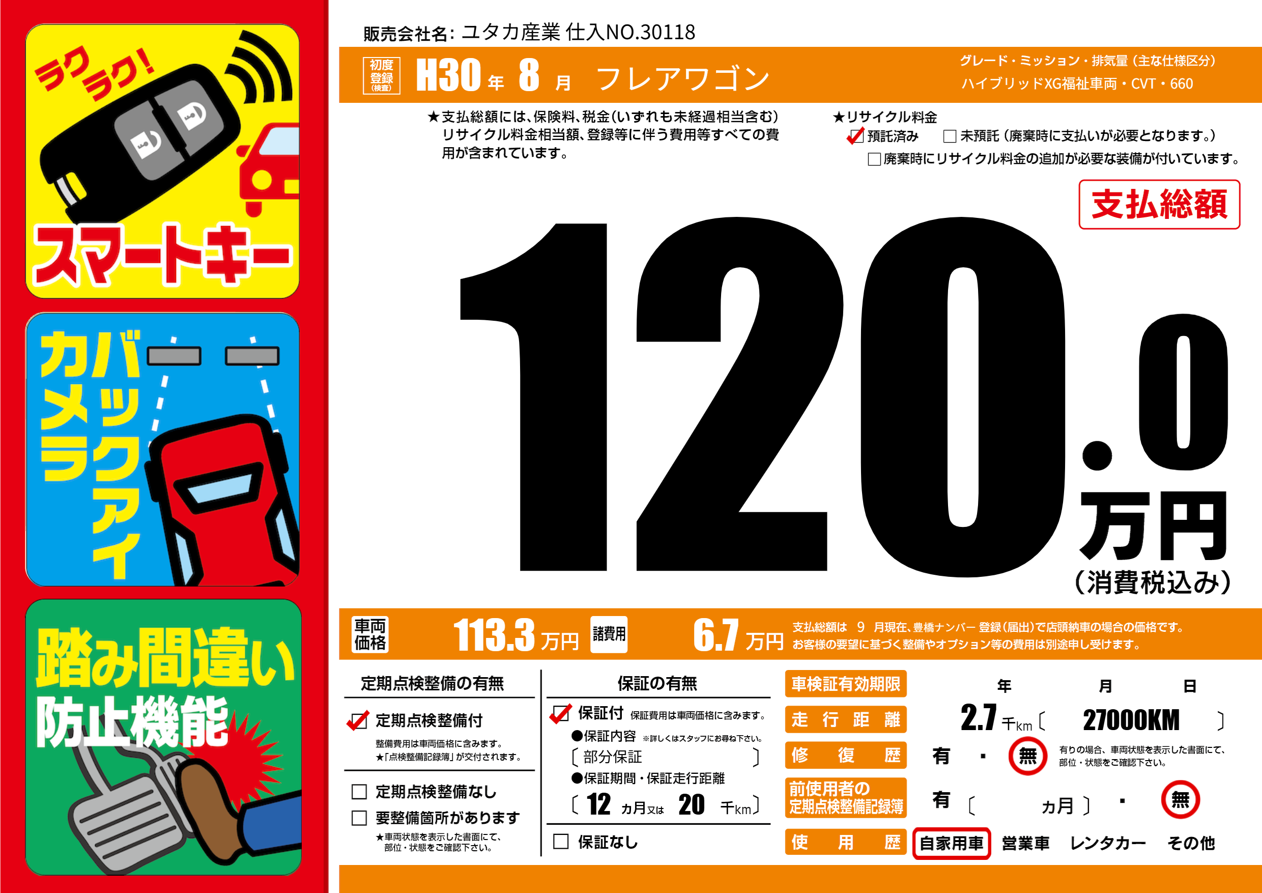 | 走行キロ | 0.2万km | 初年度登録 | H30年8月 |