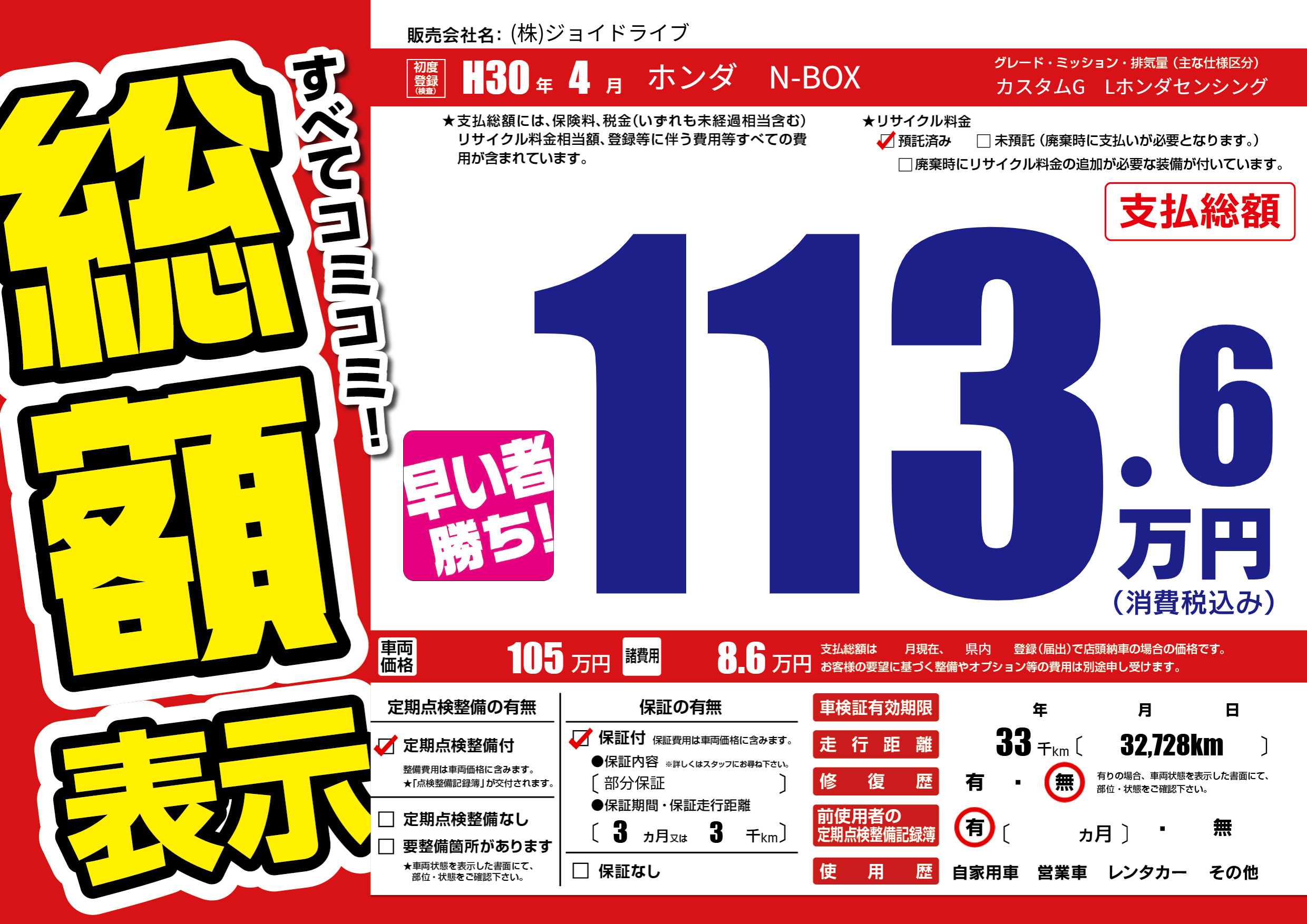 | 走行キロ | 3.3万km | 初年度登録 | H30年4月 |