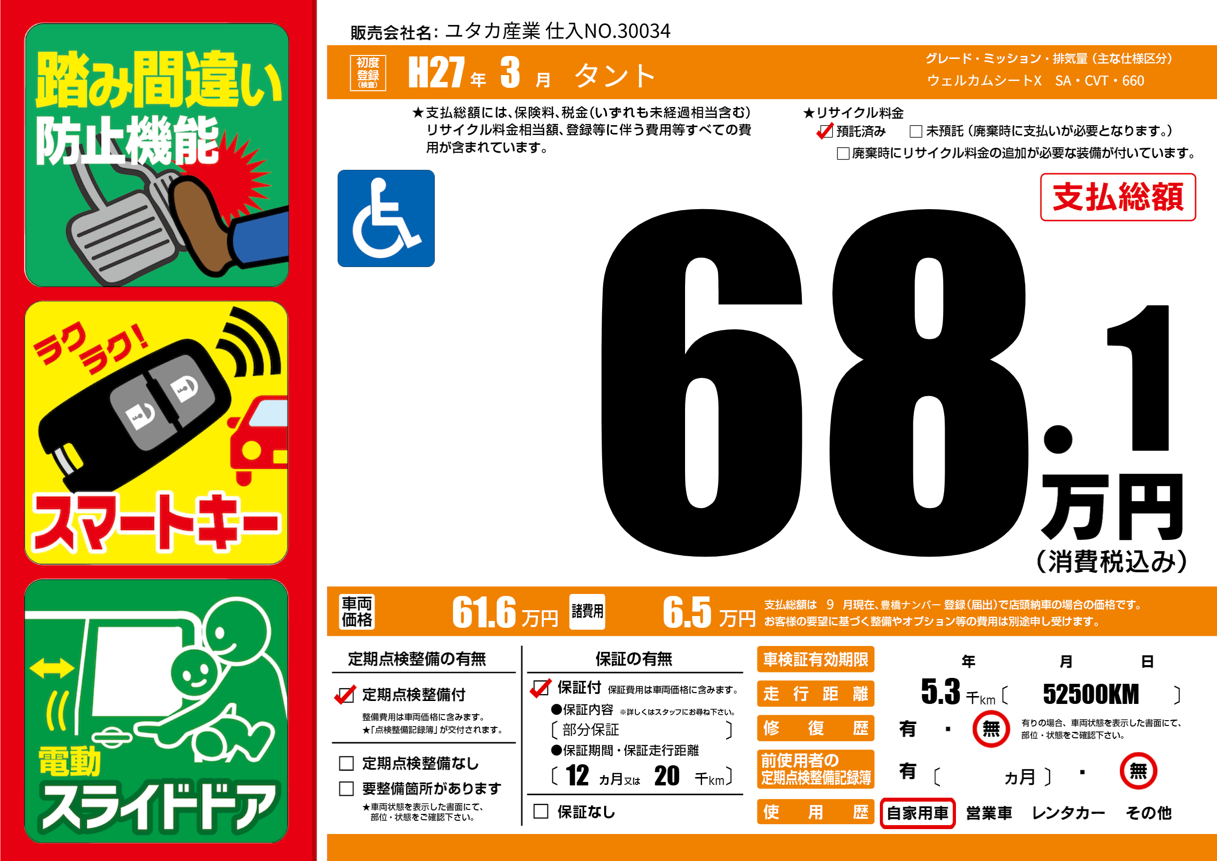 | 走行キロ | 0.5万km | 初年度登録 | H27年3月 |
