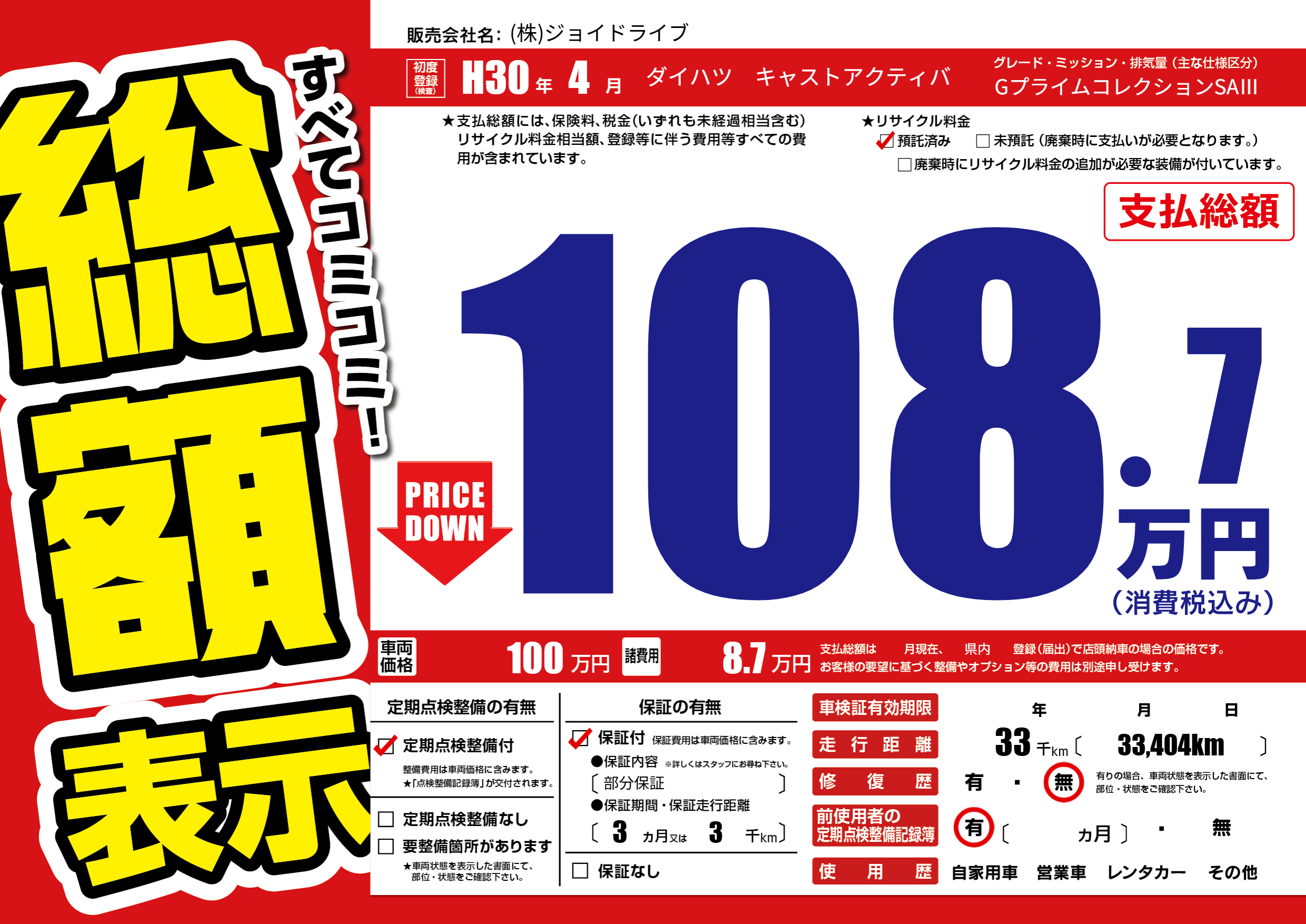 | 走行キロ | 3.3万km | 初年度登録 | H30年4月 |