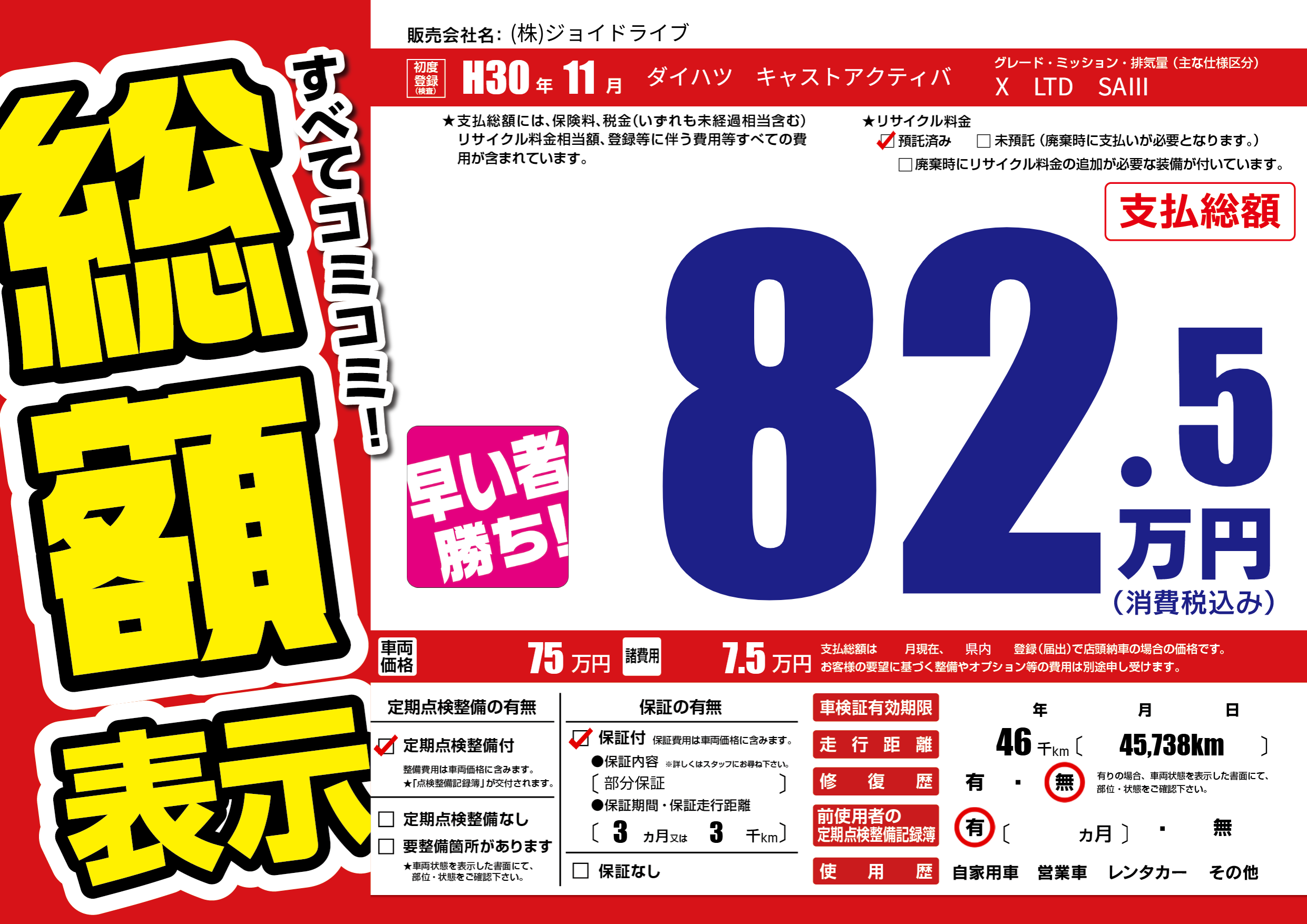| 車名 | ダイハツ キャストアクティバ | グレード ミッション 排気量 |