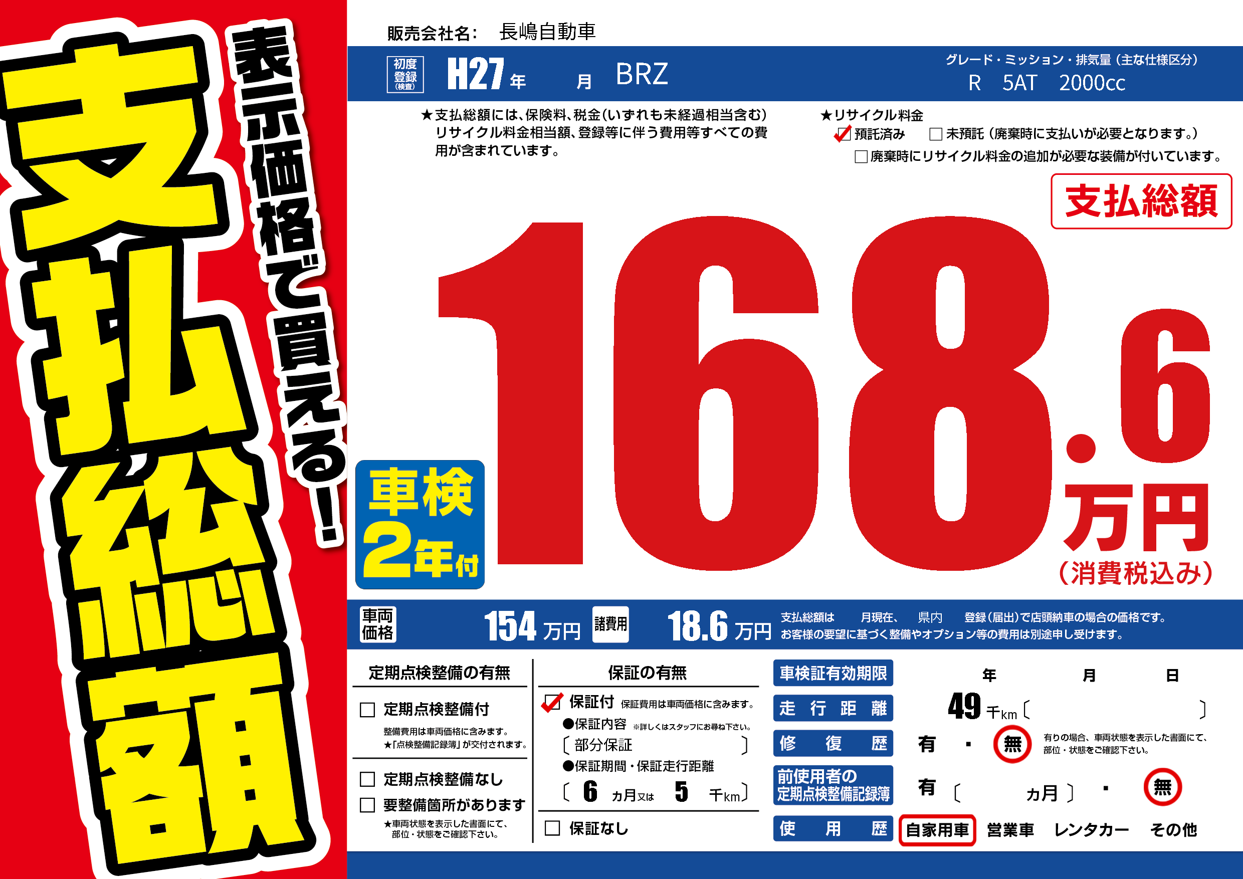保証付き 保証内容(部分保証) 6ヶ月または(5)千kmまで |