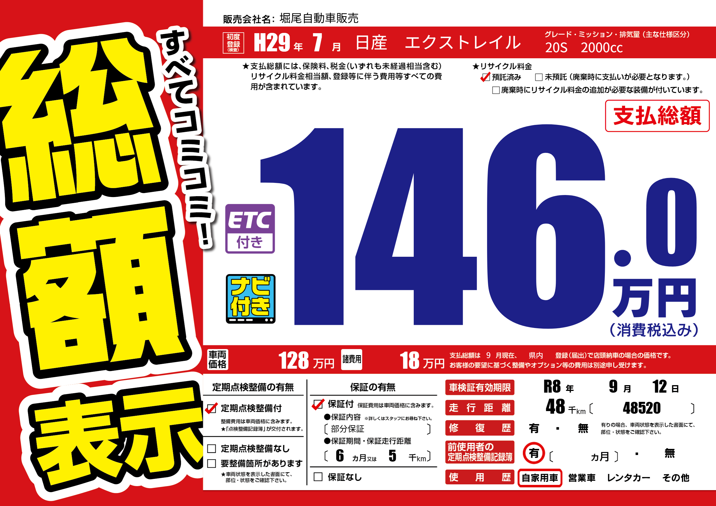 | 走行キロ | 4.8万km | 初年度登録 | H29年7月 |