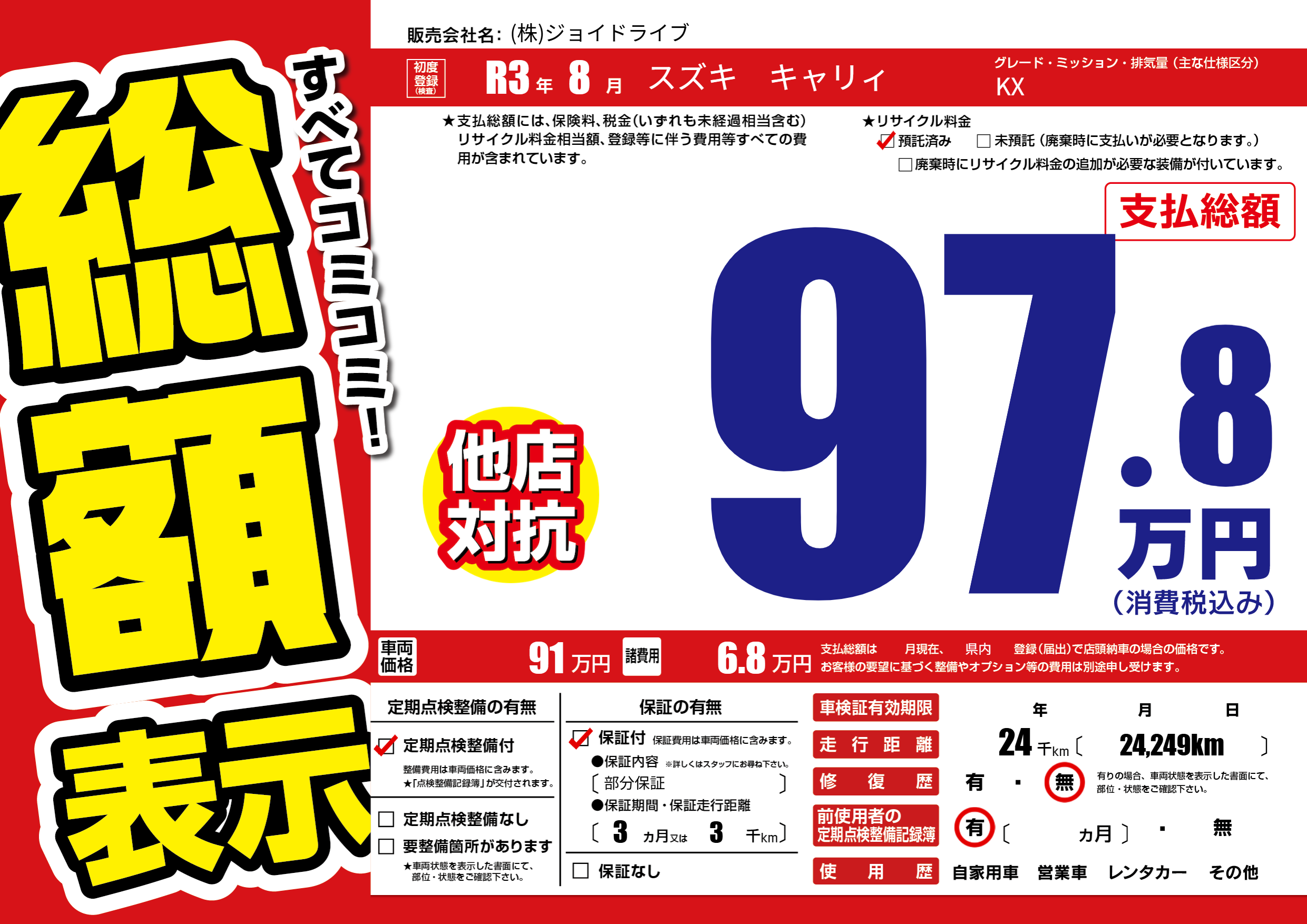 保証付き 保証内容(部分保証) 3ヶ月または(3)千kmまで |