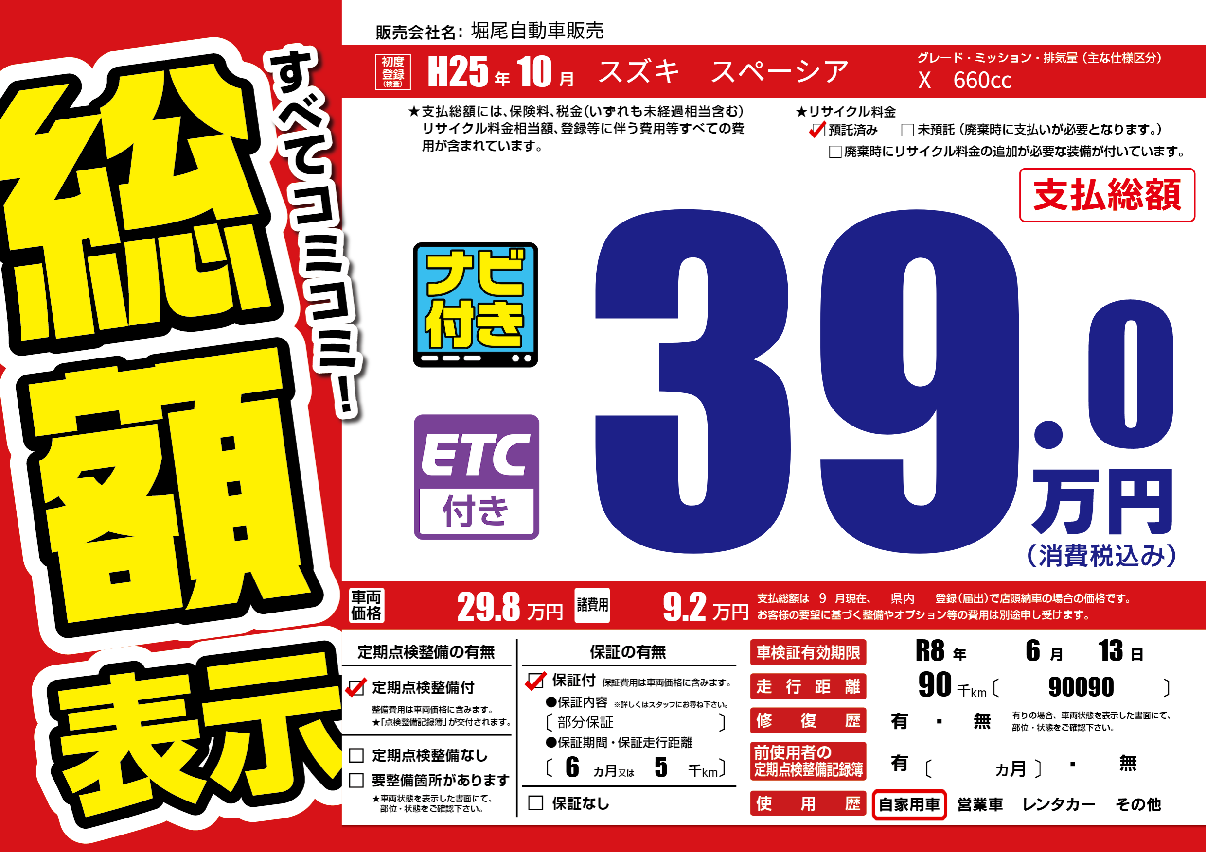 | 走行キロ | 9万km | 初年度登録 | H25年10月 |