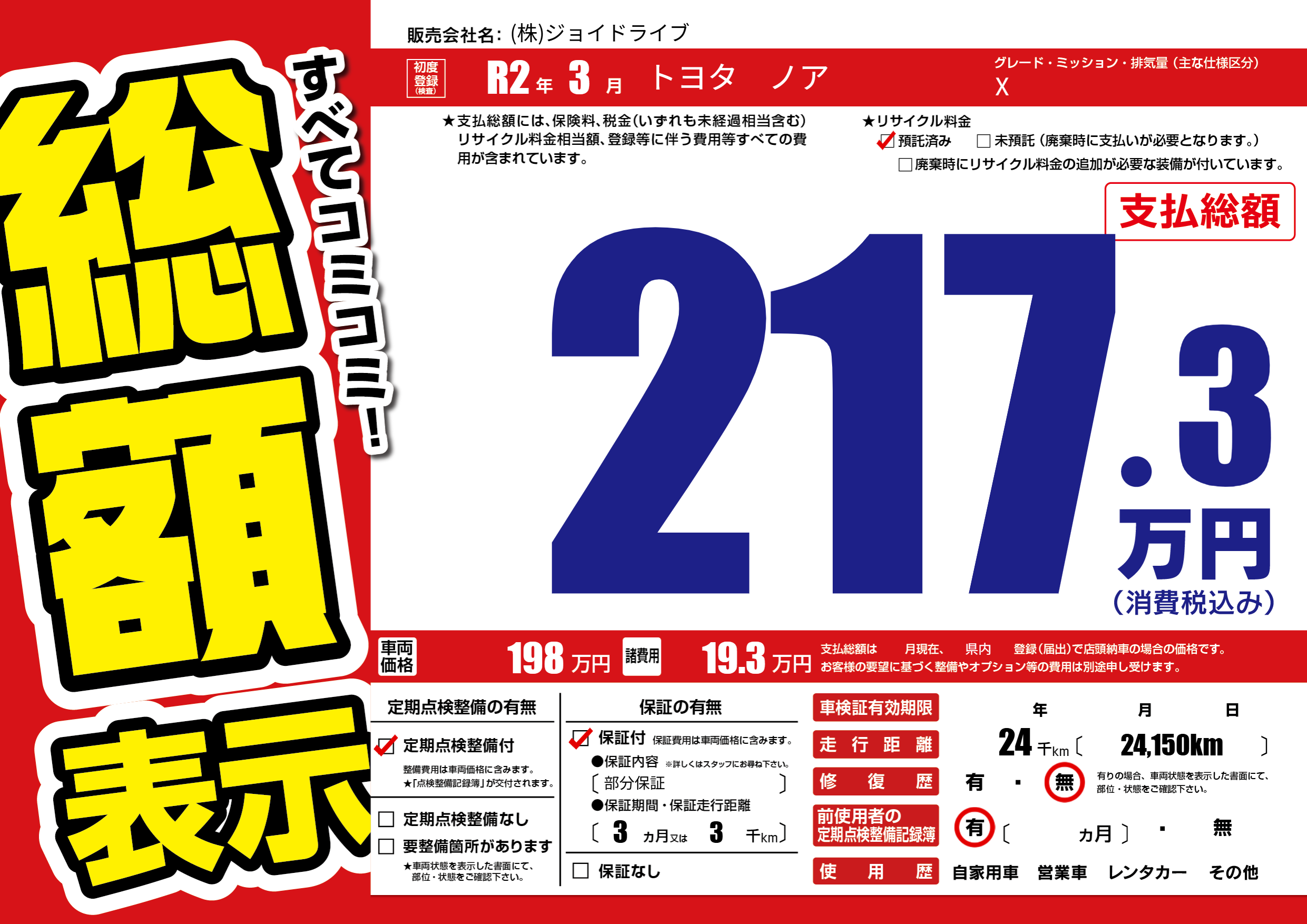 | 車名 | トヨタ ノア | グレード ミッション 排気量 |