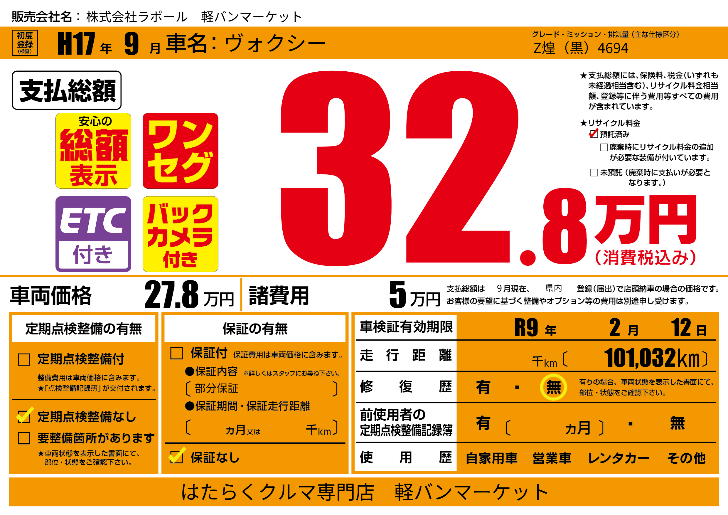なし | 車検制限 | R9年2月12月 |