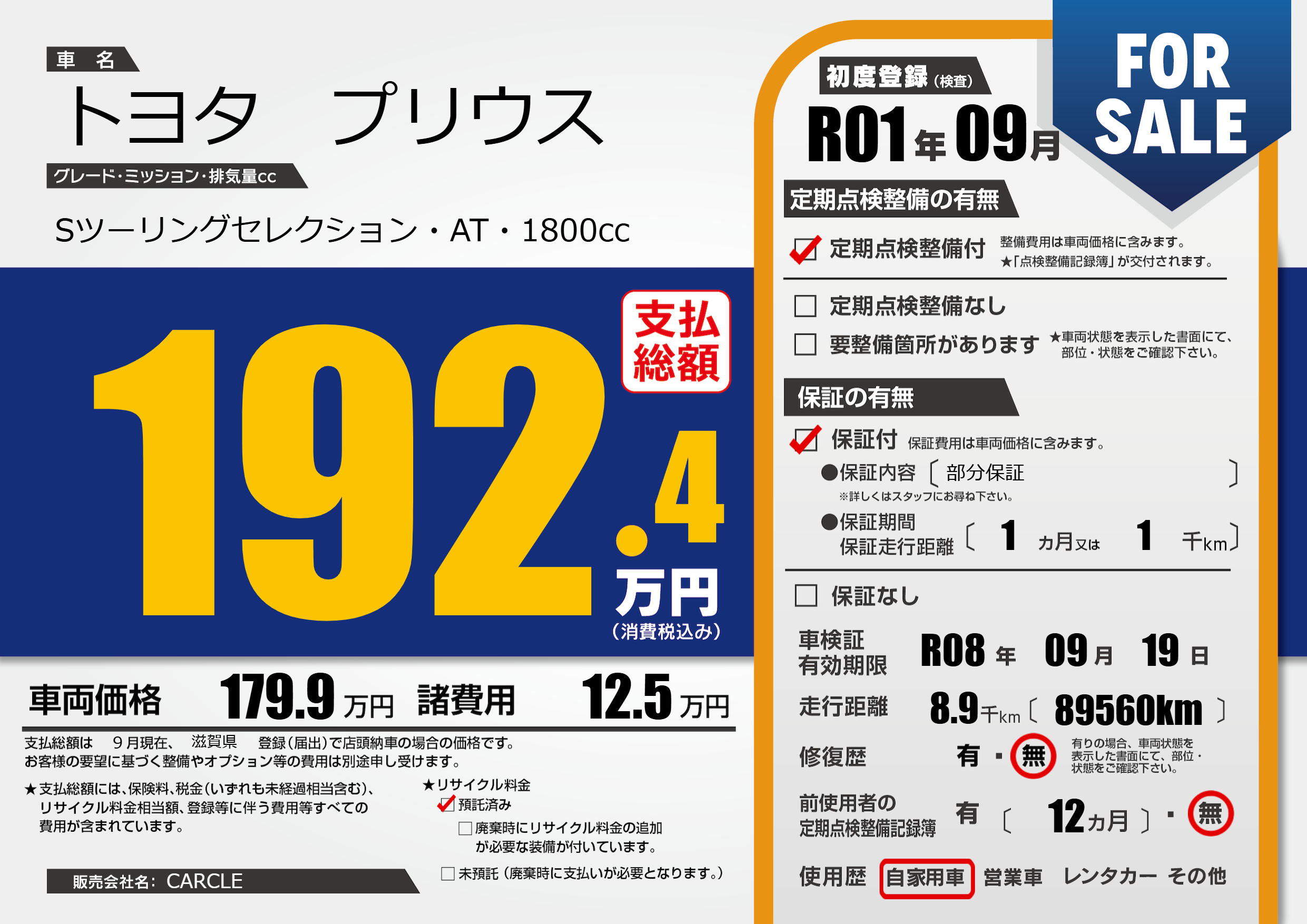 | 車名 | トヨタ プリウス | グレード ミッション 排気量 |